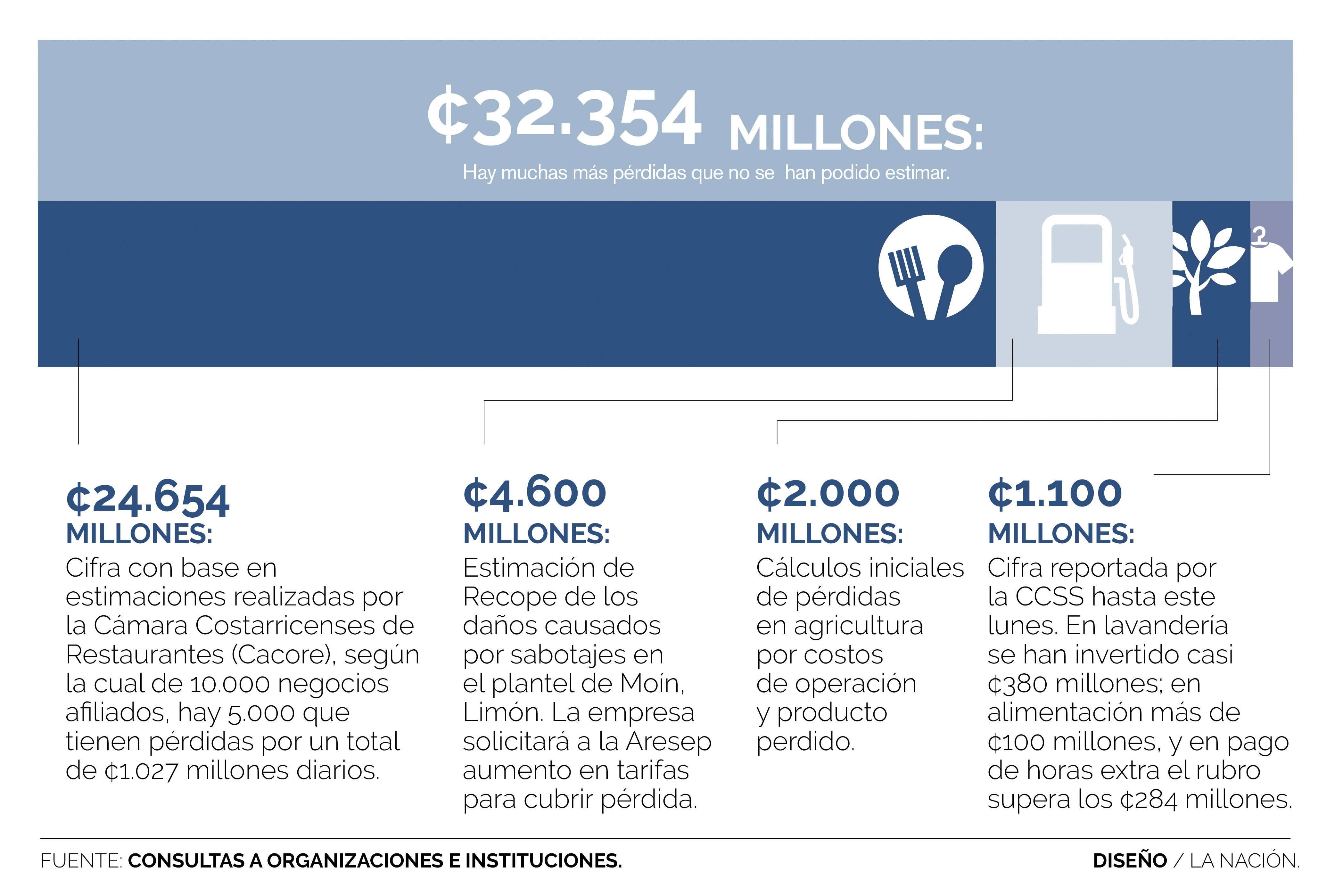 Entre las entidades que ya sacan cuentas está la Refinadora Costarricense de Petróleo (Recope), según la cual, solo las afectaciones en el plantel de Moín, Limón, le costarían ¢4.600 millones. Esa empresa pública ha sido objeto de tres ataques contra sus instalaciones.