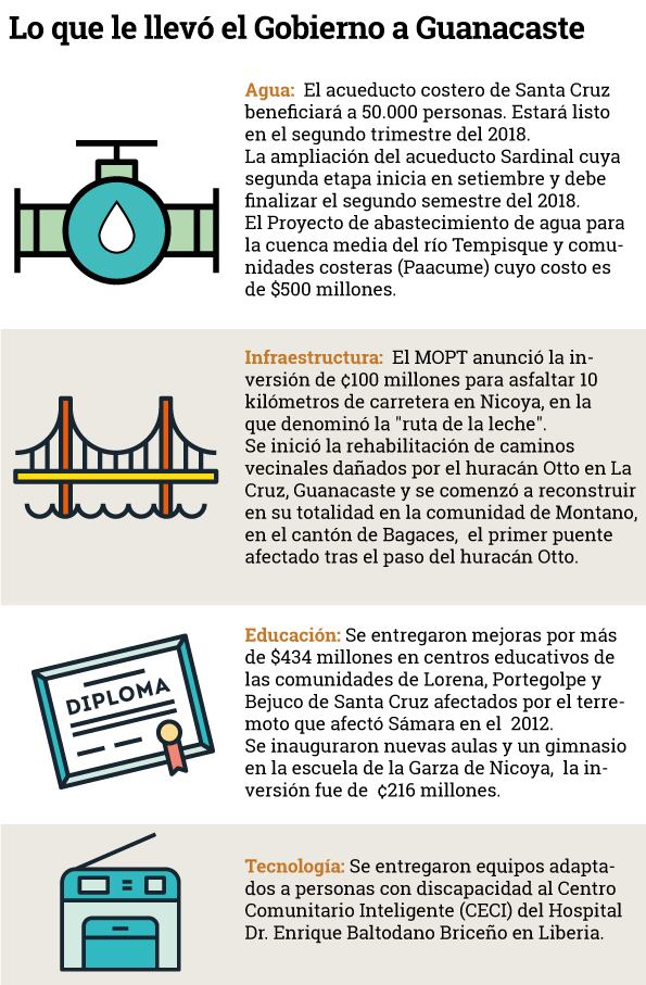 Según la información del Instituto Costarricense de Acueductos y Alcantarillados (AyA), el proyecto El Coco-Sardinal, entraría en operación en marzo del 2018. Entre tanto, la construcción del acueducto regional costero de Santa Cruz, conocido como Nimboyores, iniciará el próximo mes y estaría listo a mediados del próximo año. Ese proyecto beneficiará a unas 50.000 personas y representa una inversión de ¢8.000 millones.