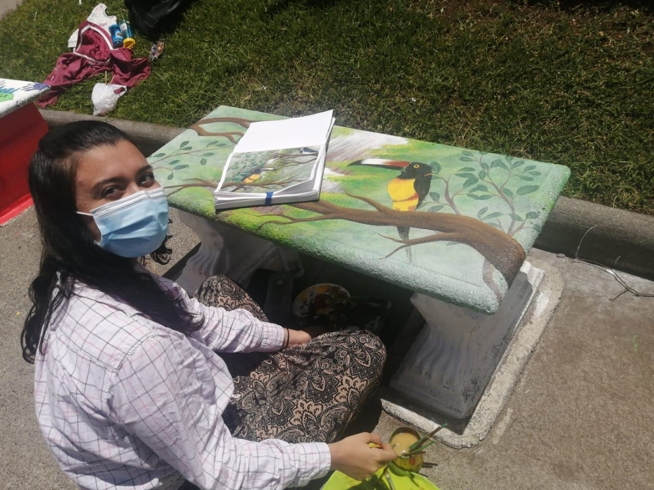 “La respuesta que hemos tenido ha sido muy buena y han podido participar desde niños hasta adultos mayores, ha sido un espacio muy valioso para compartir y cada uno en su propia burbuja familiar. Nosotros también hemos colaborado pintando las bases de las bancas y otros compañeros han realizado algunos diseños” recalcó Natalia Gómez.