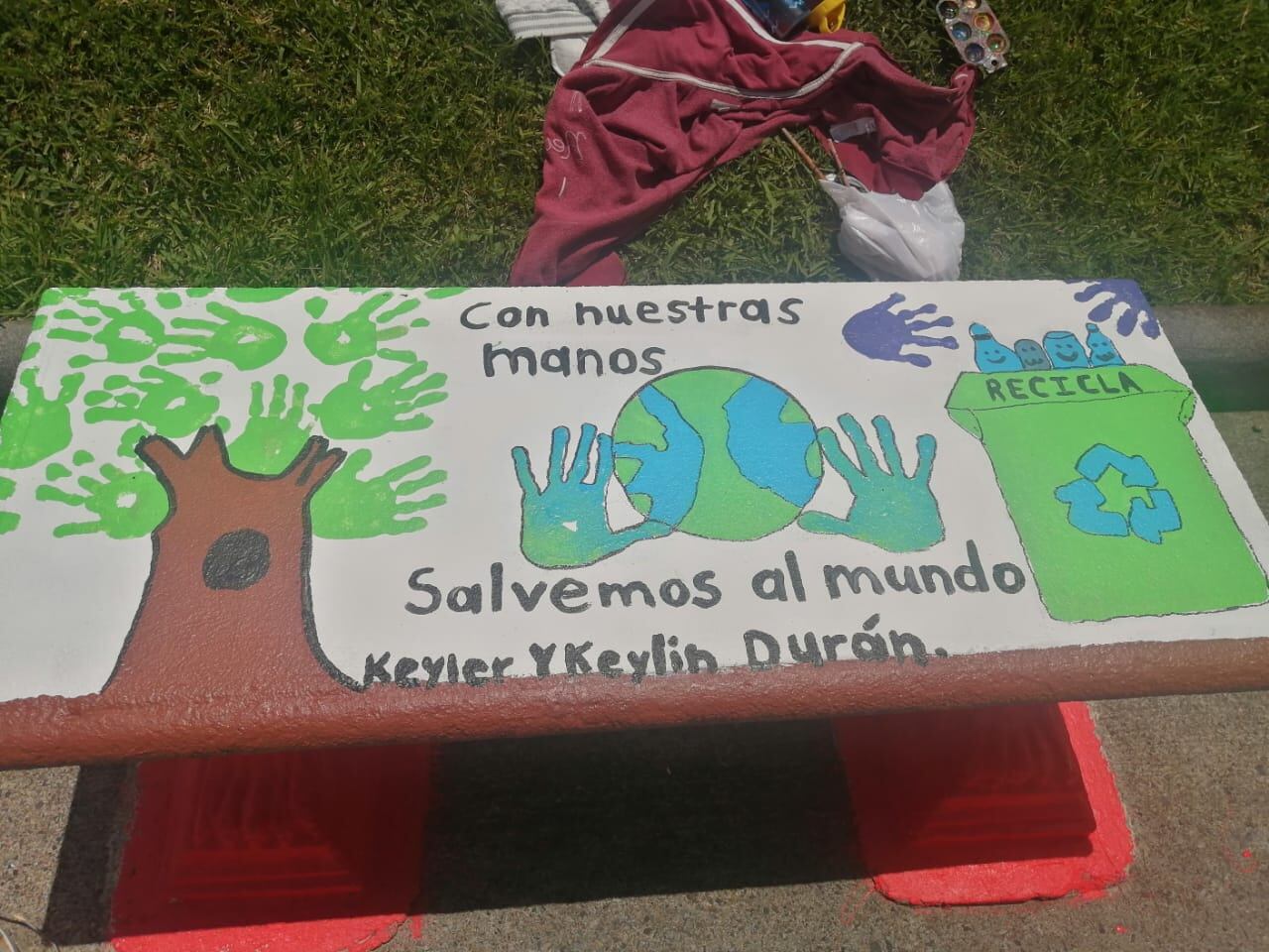 La niña fue la que realizó el diseño en la banca cuyo nombre lleva “Recurso Hídrico” y contaron con la ayuda y apoyo del alcalde que pintó un rato junto a ellas.