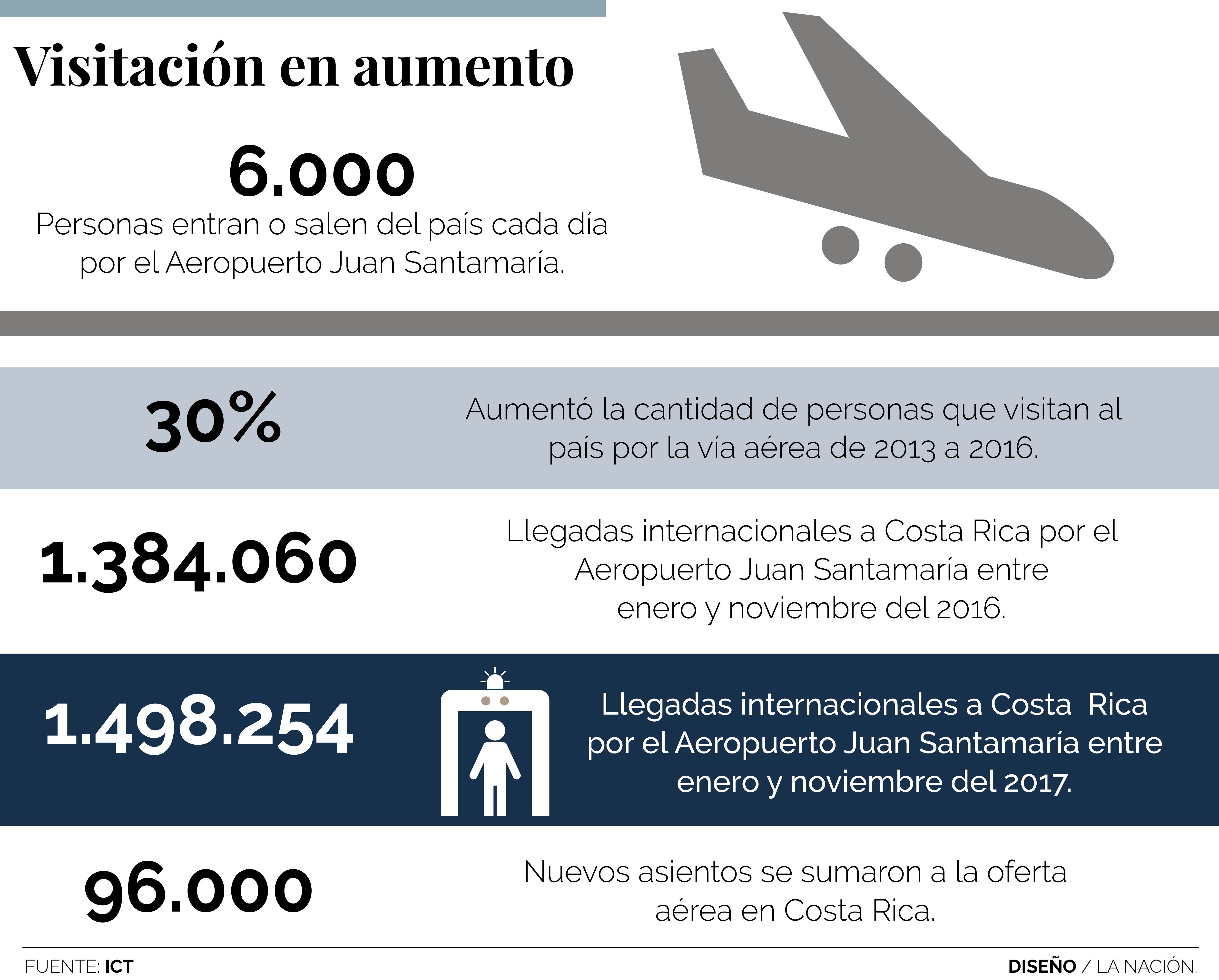 De acuerdo con datos de la Dirección General de Migración y Extranjería en el 2016, ingresaron por el Juan Santamaría 2.259.494 personas (nacionales y extranjeros). En el 2017 la cifra de ingresos alcanzó 2.492.483, es decir 232.989 más.
