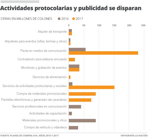 Aún así, el rubro de "publicidad y propaganda" es el de mayor repunte del 2016 a 2017 en los fondos para Comunicación Institucional al ir de ¢56 millones a ¢230 millones; revelan los planes de compras anuales del AyA para ambos períodos, a los cuales tuvo acceso este diario.