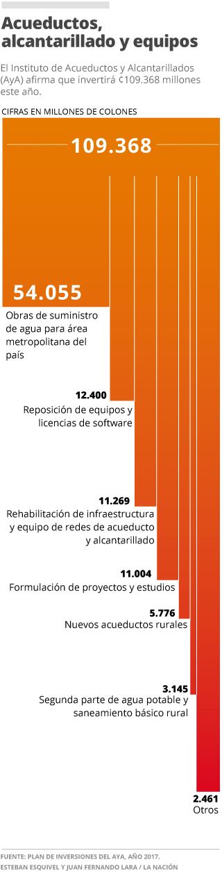 Hay 32% (¢35.122 millones) para obras de alcantarillado, 17% (¢18.866 millones) para mejoras en la propia gestión del AyA y 11% se irá en unidades del Instituto centradas en el estudio, el diseño y la formulación de nuevos proyectos.