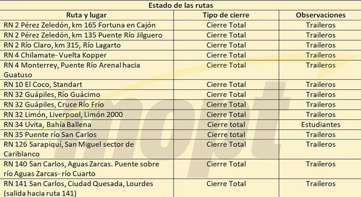 Otras vías con dificultades en la zona norte son: barrio Lourdes, entrada a Ciudad Quesada, que impide la salida hacia Zarcero; el puente sobre el río Aguas Zarcas (no hay paso entre Aguas Zarcas y Ciudad Quesada); puente Ferry (No hay paso Pocosol-Cutris y Los Chiles), puente Arenal. (No hay paso hacia Monterrey).También San Miguel-Vara Blanca (no hay paso por Cinchona).