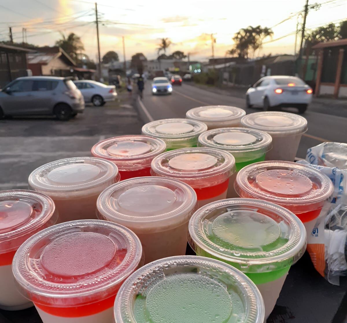 Él lleva 60 vasitos con postres, a veces se le venden todos y a veces no. Comienza a trabajar desde temprano en la preparación de estos dulces y a las 3 p. m., aprovechando el congestionamiento vial, se va caminando a la calles a venderlos. En ocasiones, en Alajuela centro, otras en Villa Bonita o San Antonio del Tejar.