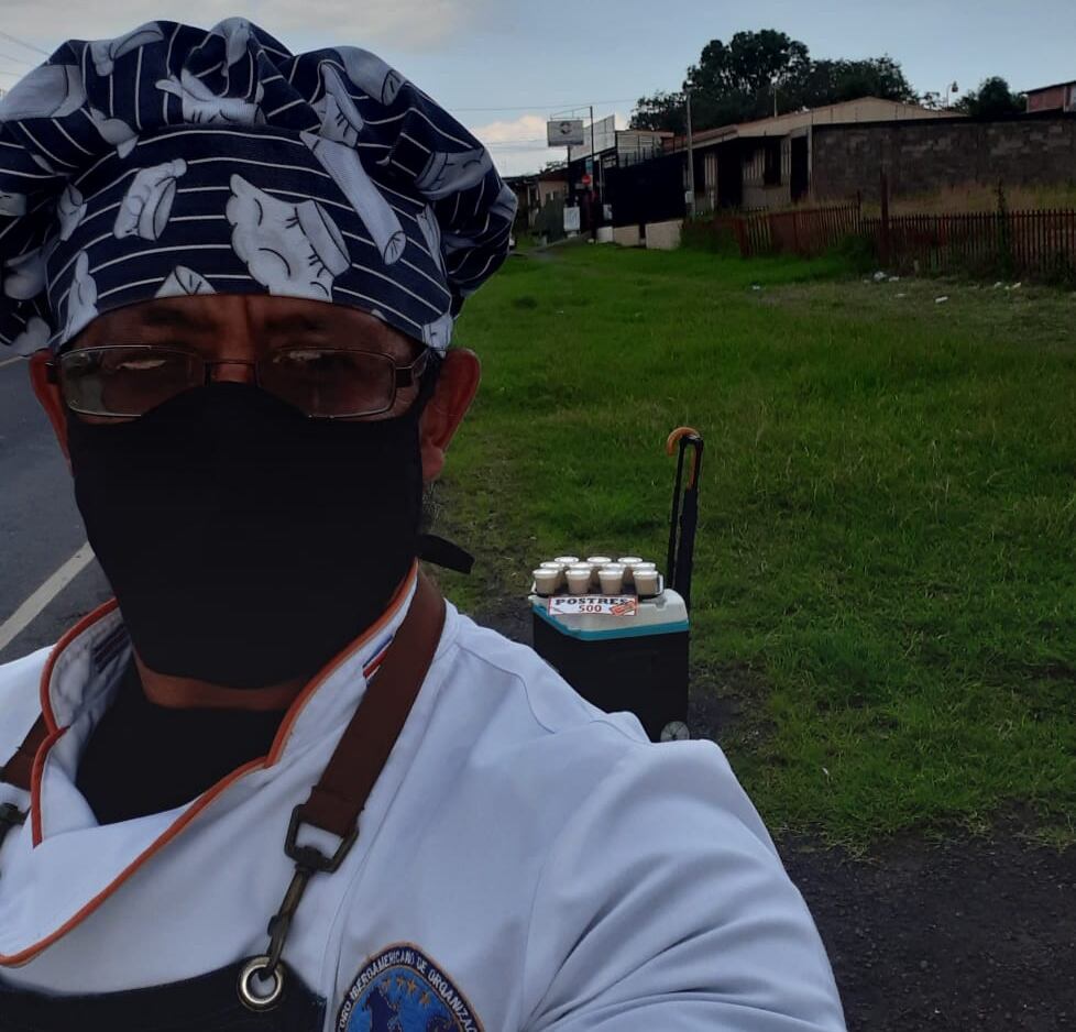 “Me dí a la tarea de vender los postres en Alajuela, puerta a puerta. Es una bendición leer mensajes que gratifican el esfuerzo bajo el sol o la lluvia, para traer sustento a mi familia, en especial mi esposa, quien está en proceso médico a causa del cáncer, todo mi esfuerzo es por y para ella. Es entendible que muchos me vean y les dé cosa comprar, por un tema de manipulación, el cual yo cuido en los detalles, uso alcohol y jabón liquido para atender a cada uno de ustedes que bendicen el pan en mi mesa”, relató García quien dice que porta su uniforme de chef porque sus clientes “merecen respeto”.