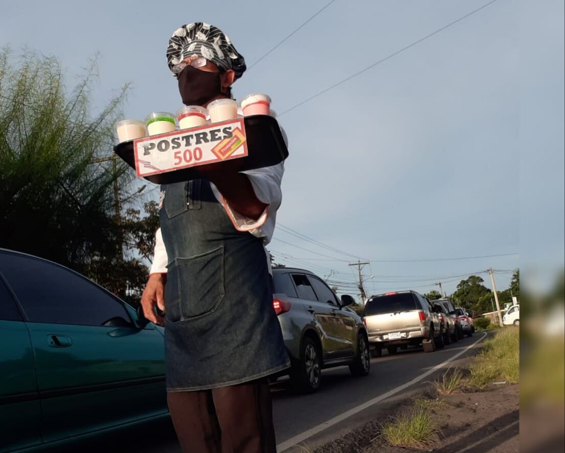 El chef José Alberto García Villareal es conocido por los conductores como “el señor de los postres”. Desde hace un año y tres meses este vecino de San Pedro de Santa Bárbara de Heredia se planta con su hielera en las calles de Alajuela a vender sus dulces a ¢500. Va muy formal, con su delantal, su gorro, pantalón y camisa de vestir.