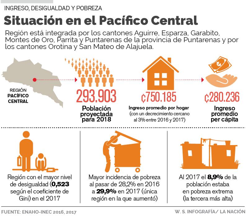 La Encuesta Nacional de Hogares (Enaho) 2017, del Instituto Nacional de Estadística y Censo (INEC), reveló que el Pacífico Central (de la que es parte el cantón central de Puntarenas), es la región con el mayor nivel de desigualdad (0,523 según el coeficiente de Gini). Además, respecto al 2016, fue la única que tuvo un leve aumento en el nivel de pobreza, pasando de 28,2 % a 29,9 %.