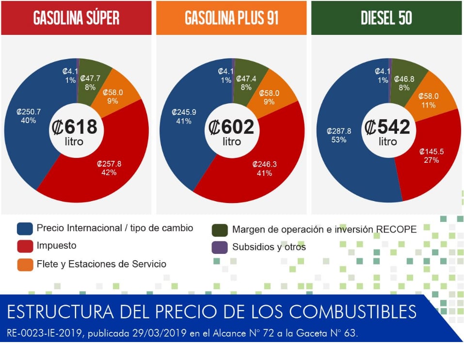 Por otra parte, un porcentaje del dinero cobrado a los consumidores responde a un margen de comercialización e inversión de Recope, el cual hoy equivale a un 8% de los precios.