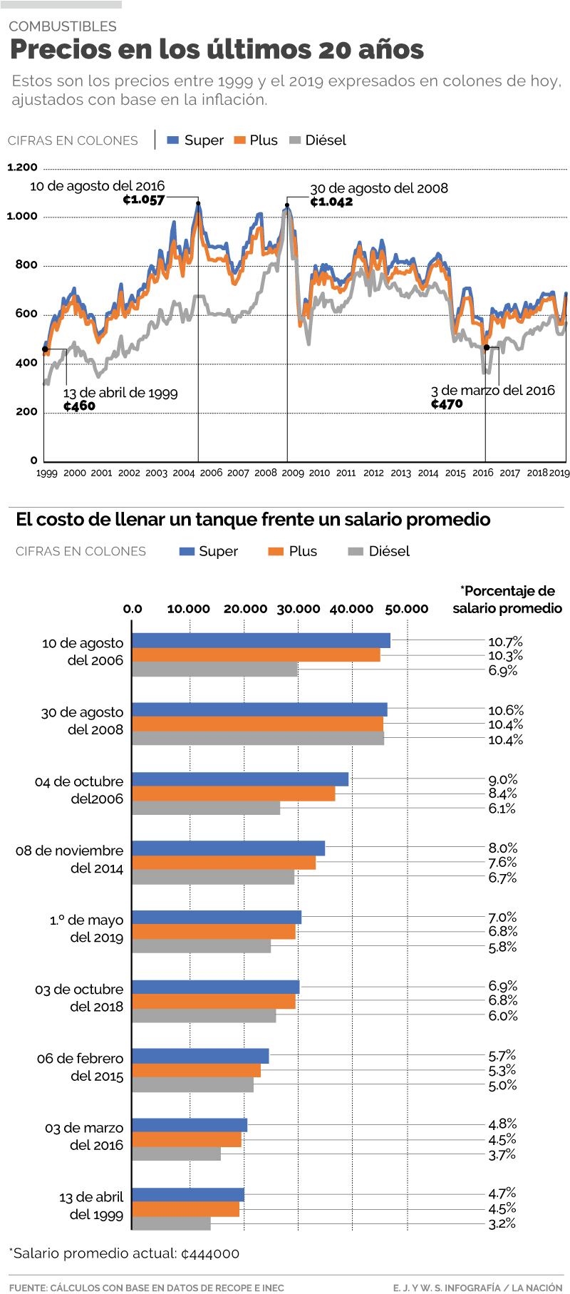 Para poder conocer los momentos más caros y más baratos en el consumo de combustibles en Costa Rica, La Nación actualizó cada uno de los precios que se han registrado en las últimas dos décadas con base en la inflación, a fin de presentarlos en colones de hoy, es decir, de traerlos a valor presente.
