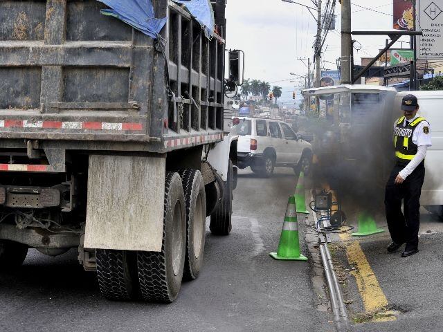 El oficial de Tránsito Malken Barrantes se tragó todo el humo de esta vagoneta que ayer superó los límites permitidos de emisión de gases contaminantes.
