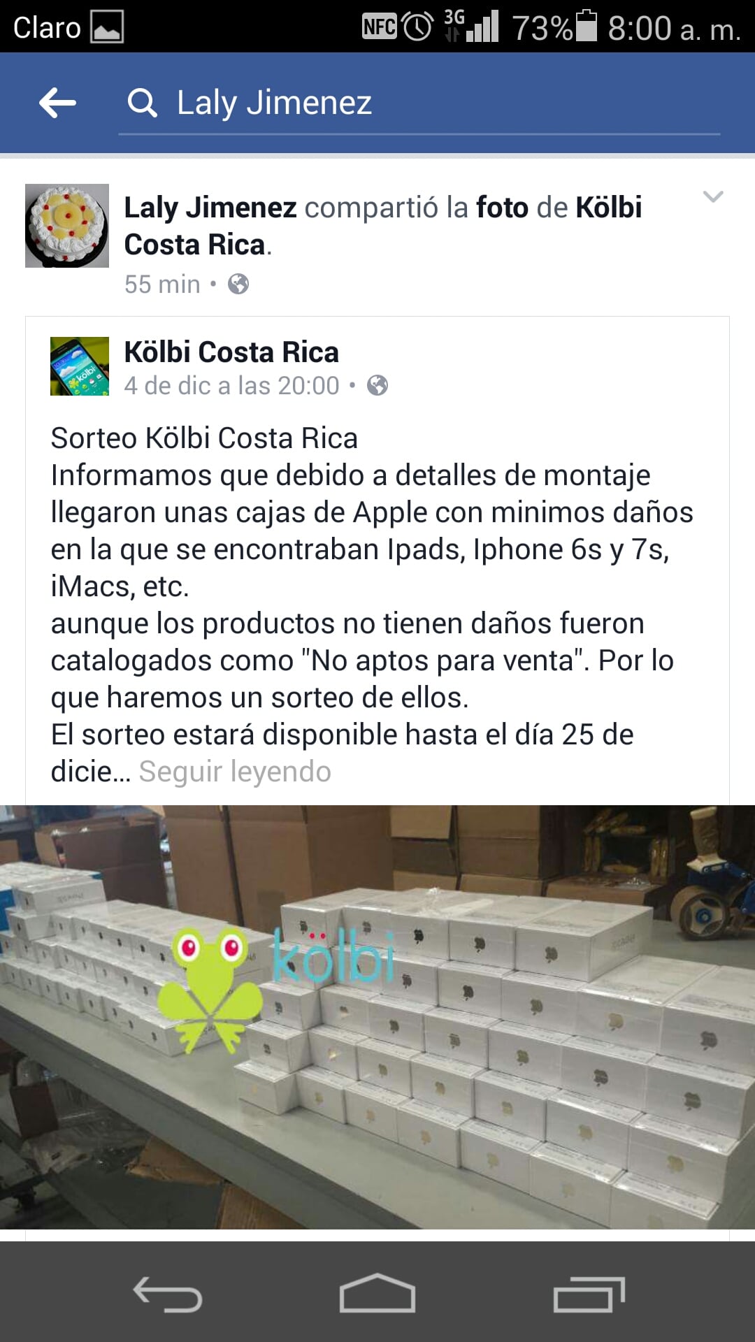 La estafa en cuestión anunciaba lo siguiente: Sorteo Kölbi Costa Rica. Informamos que debido a detalles de montaje llegaron unas cajas de Apple con mínimos daños en la que se encontraban Ipads, Iphone 6s y 7s, iMacs, etc. aunque los productos no tienen daños fueron catalogados como "no aptos para venta". Por lo que haremos un sorteo de ellos. El sorteo estará disponible hasta el día 25 de diciembre".