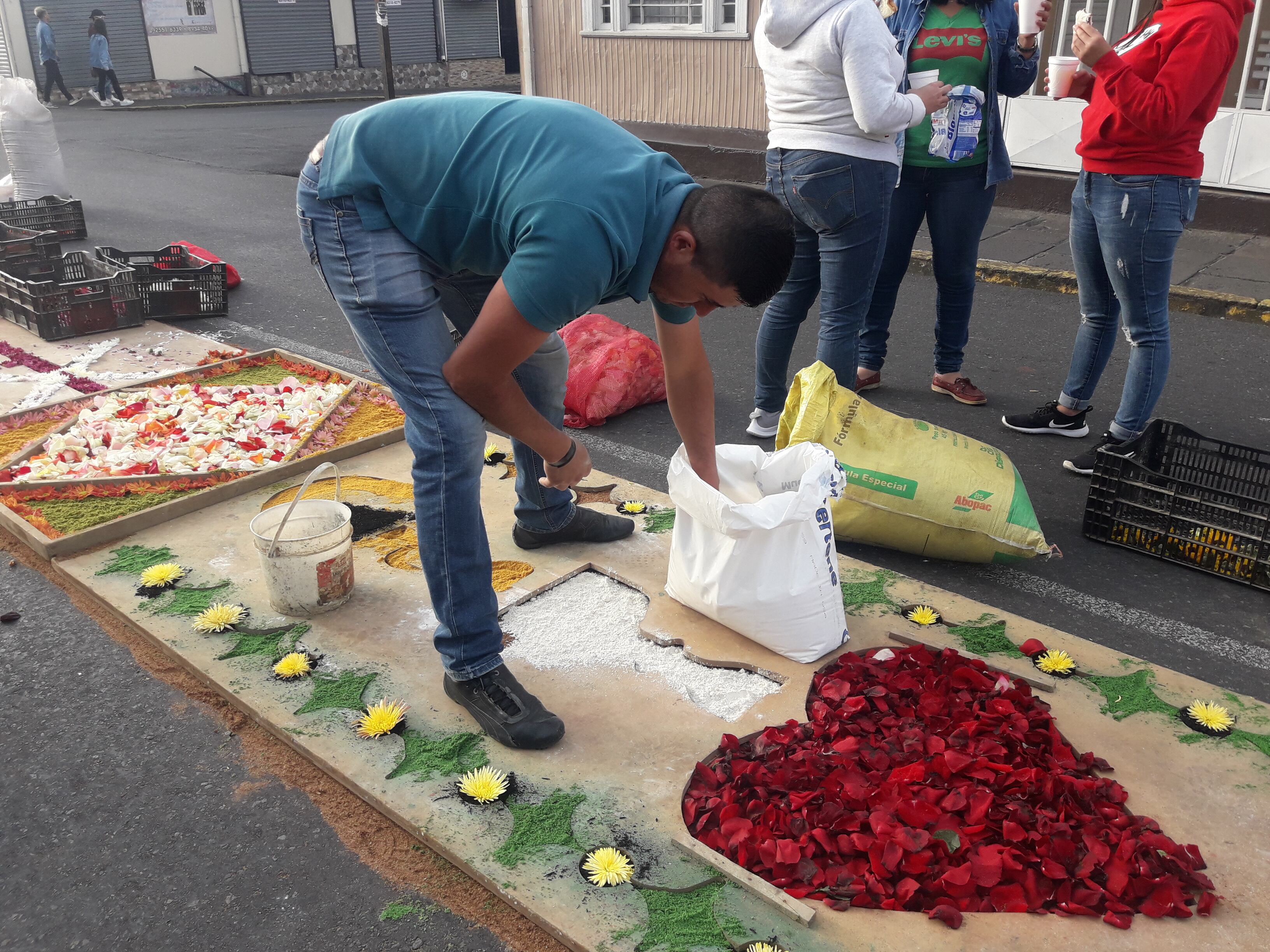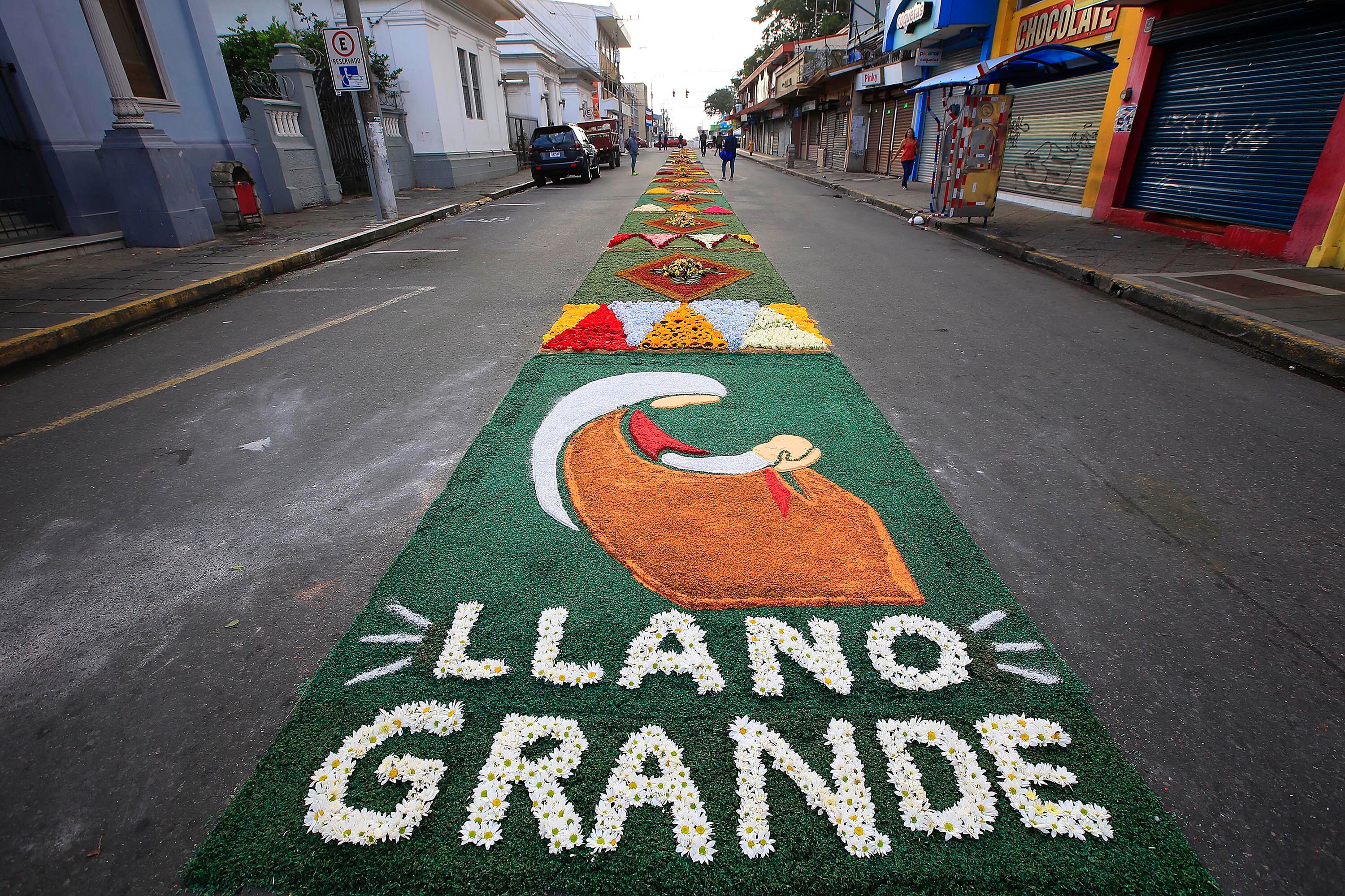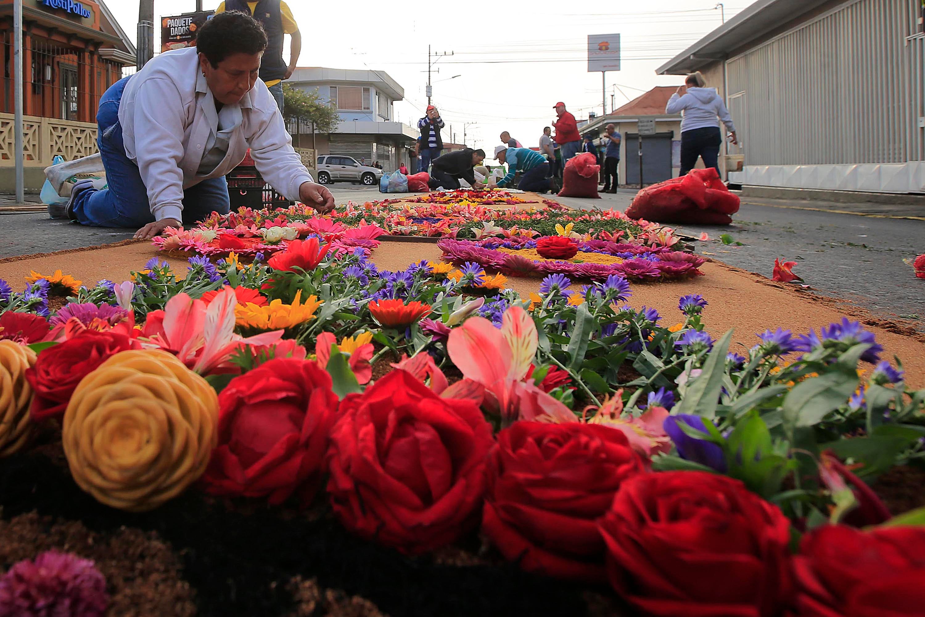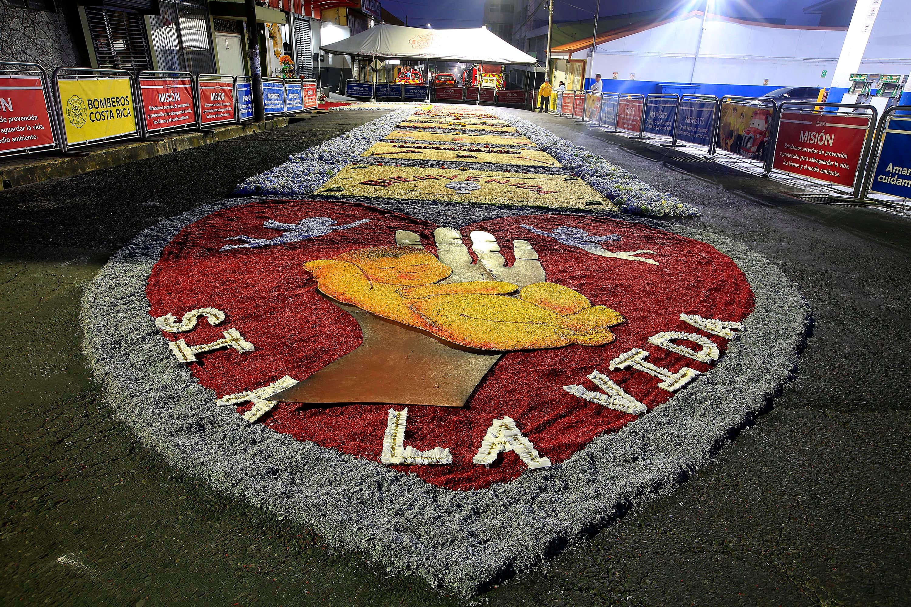 Esta alfombra tiene cuatro metros de ancho y 92 de largo y flores como hortensias y rosas; los tintes son costarricenses y otros extranjeros que mandan a traer a Guatemala.
