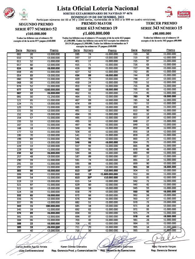 El número 19 con la serie 613 es el premio mayor del Gordo navideño de este 2021, el cual quedó repartido en seis de siete provincias, la excepción fue Guanacaste. Los afortunados portadores de esas fracciones recibirán ¢40 millones por cada pedacito o ¢1.600 millones si tienen un entero.