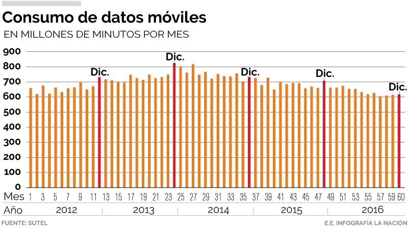 En el año 2013, los ticos con celular hablaron un promedio mensual de 732 millones de minutos excepto en diciembre cuando fueron 825,8 millones de minutos: 12.8% adicional respecto al promedio mensual del año.