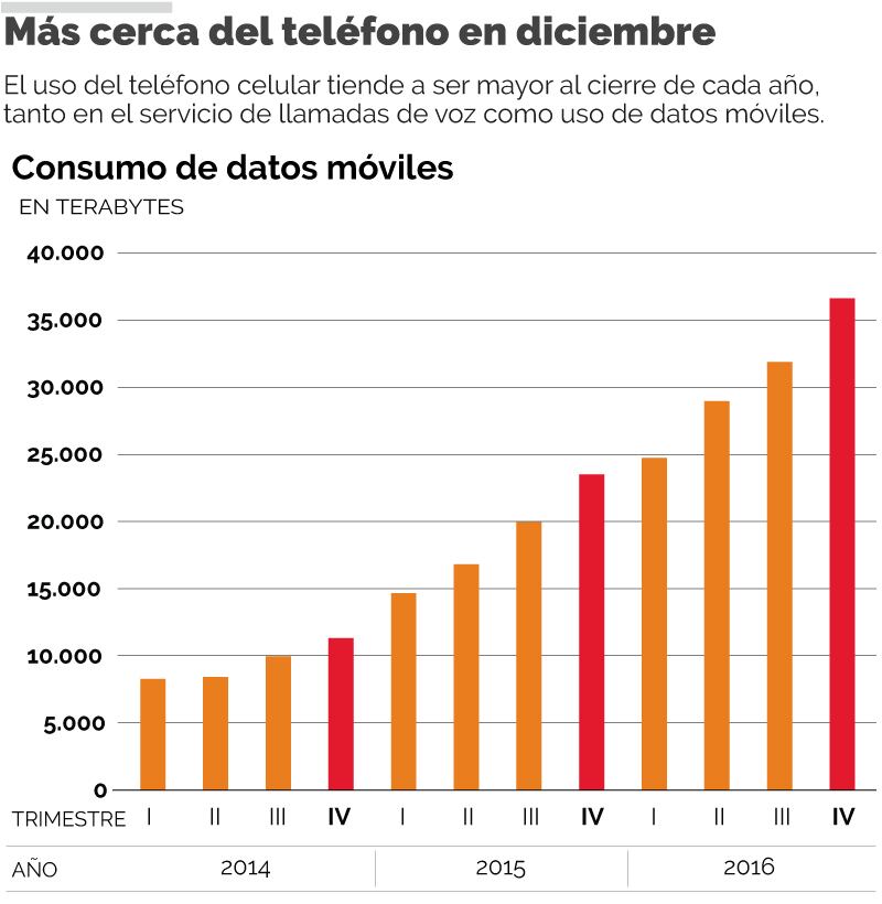 Esa tendencia se repitió en el 2015 al pasar de 14.663 TB de datos móviles en el primer trimestre a 23.503 en el último (60% más) y, en Internet fija, el consumo pasó de 55.998 TB en los primeros tres meses de ese año a 76.726 TB en los últimos tres (37% más).