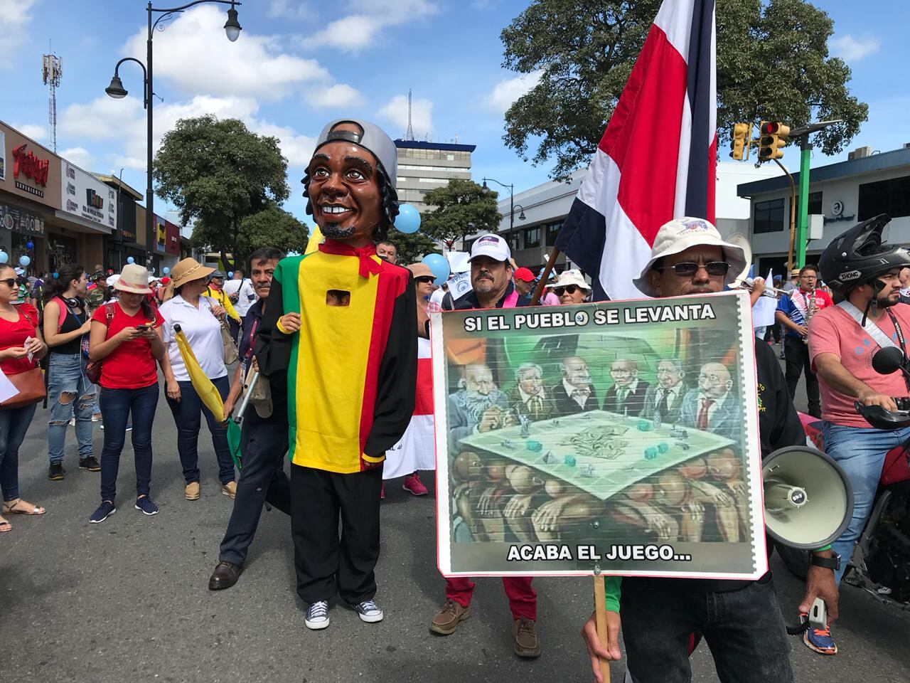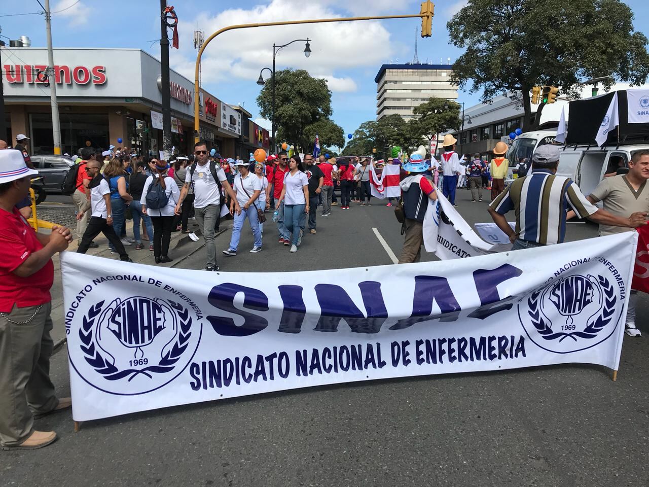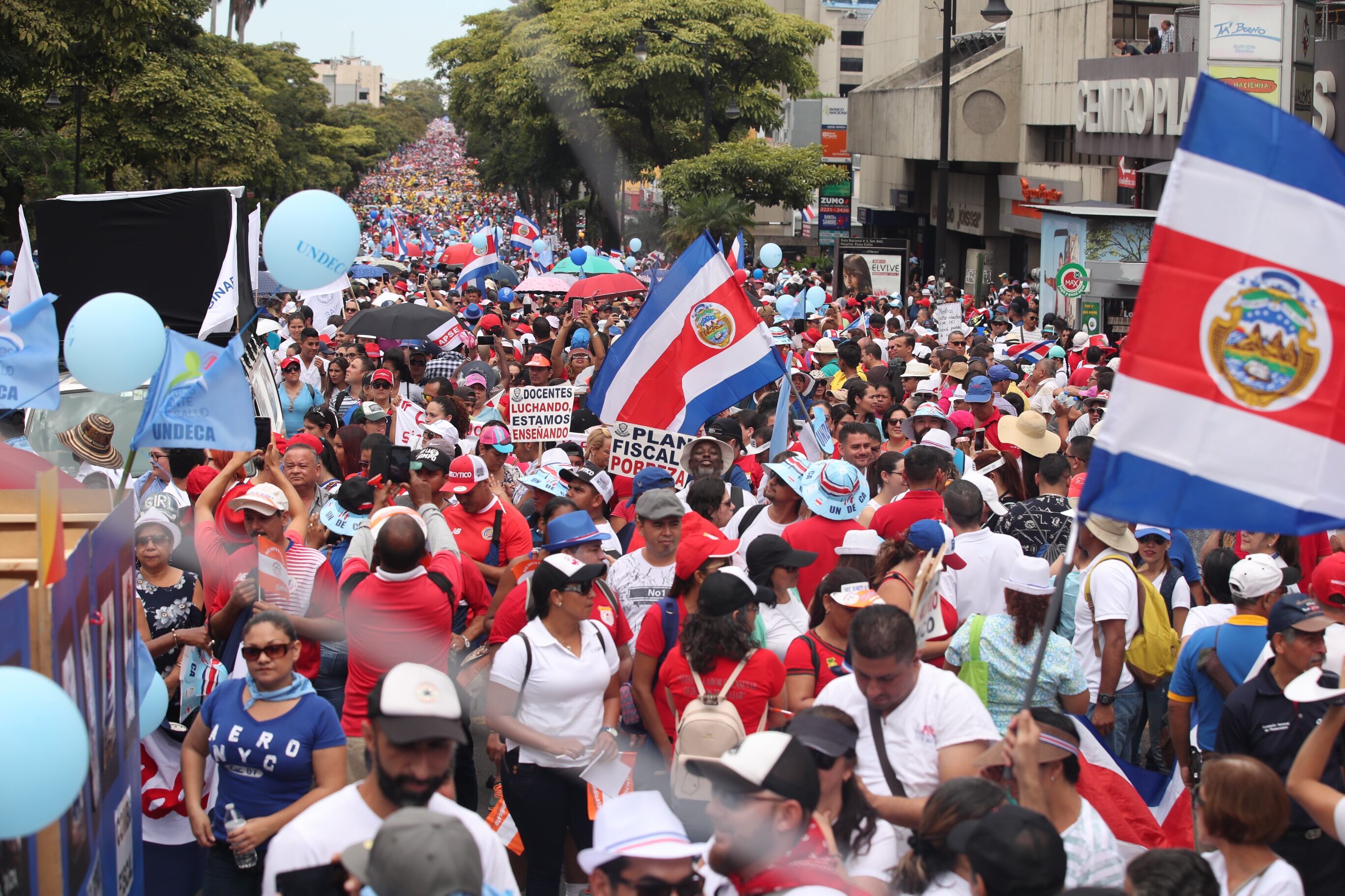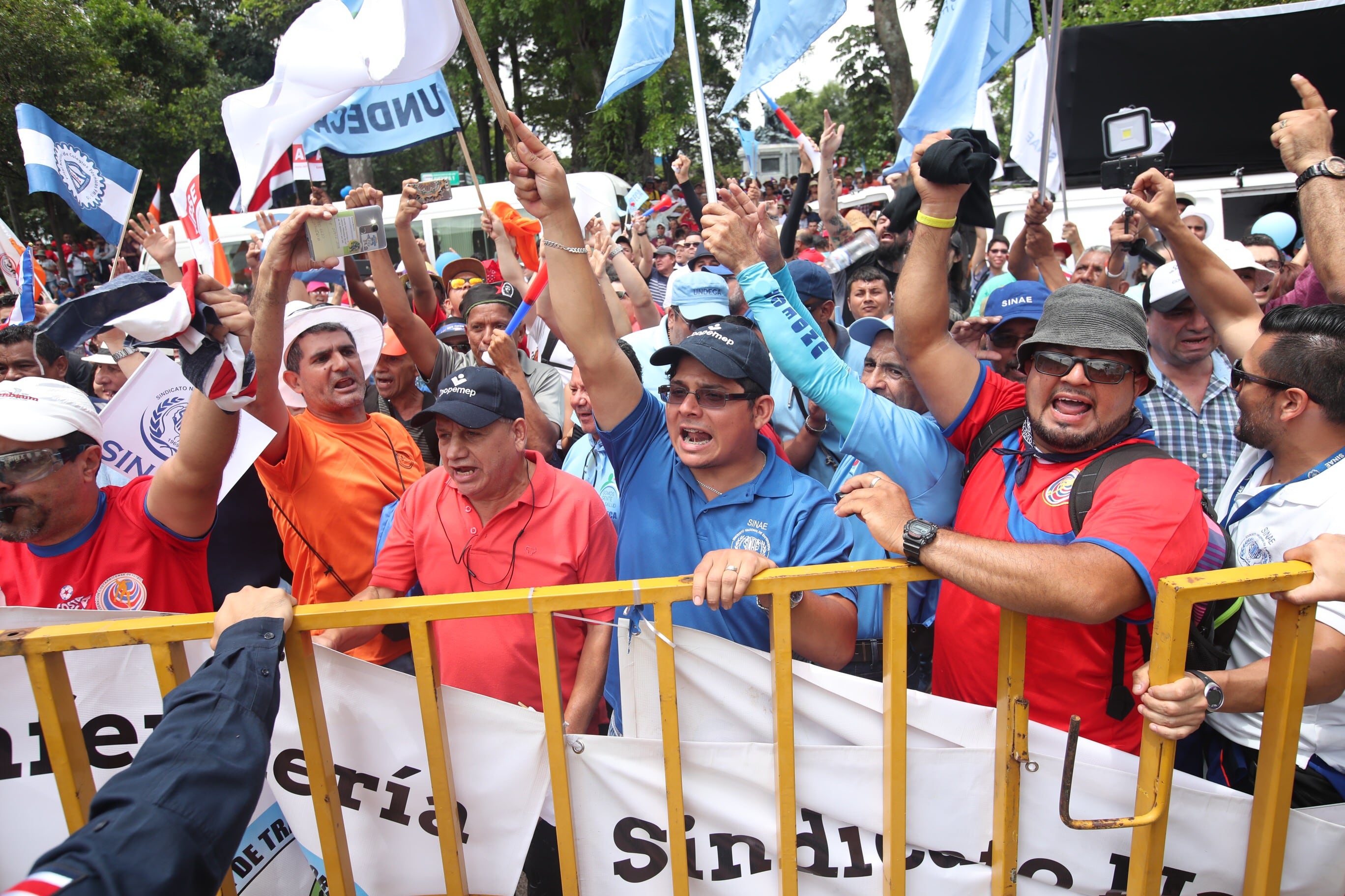 Banderas y otros signos externos de la Asociación Nacional Empleados Públicos (ANEP), Sindidato de Trabajadores de la Universidad Nacional (Situn), Unión Nacional de Trabajadores y Trabajadoras (UNT), Unión Médica Nacional y Sindicato de Trabajadores y Trabajadoras de la Educación Costarricense (SEC), así como empleados de varias municipalidades, entre ellas San José,Turrialba y Puntarenas, son notables en la marcha. Algunos gritan consignas como “Fuera Rodolfo Piza”.