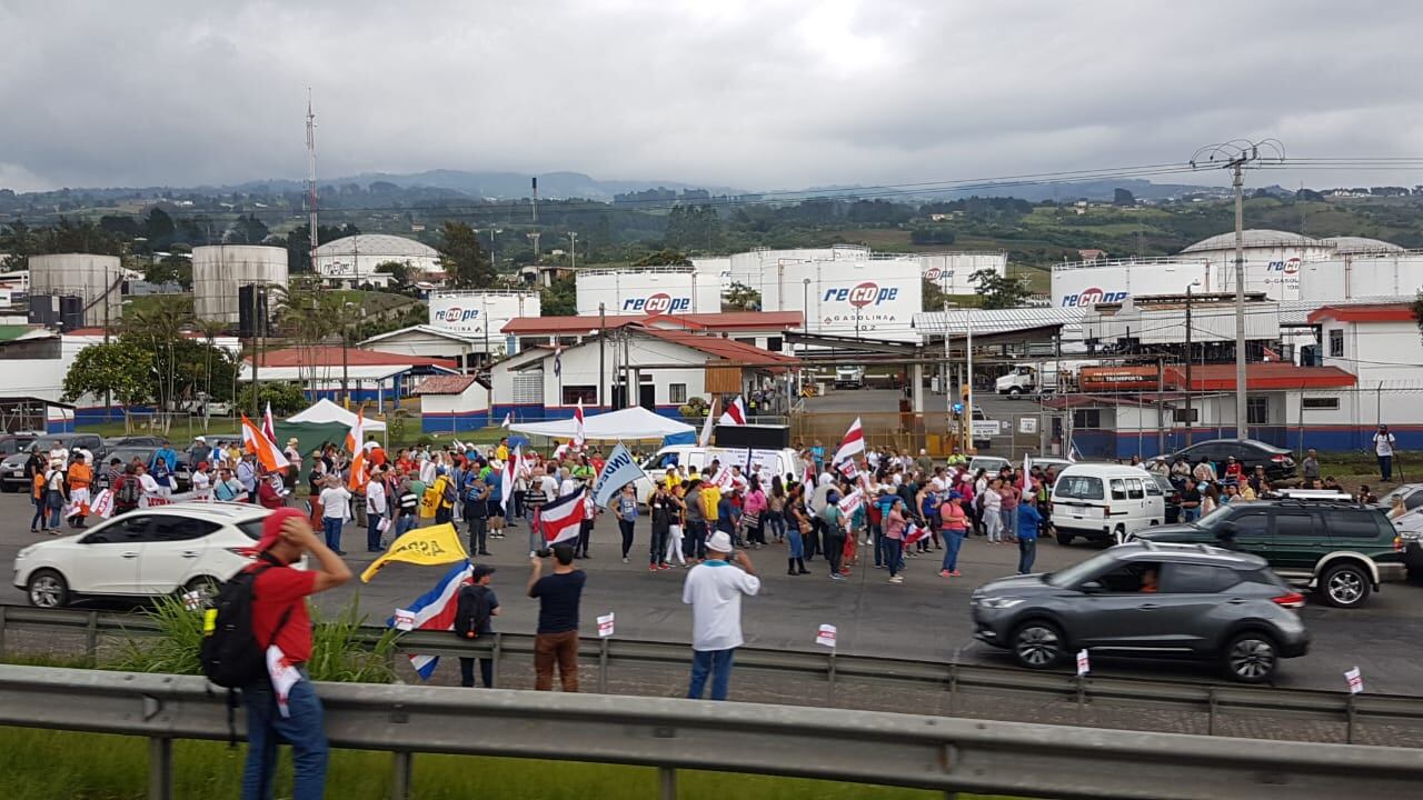 Un grupo de manifestantes protestan, desde las 3 p. m. en las afueras de Recope, en el Alto de Ochomogo, Cartago.