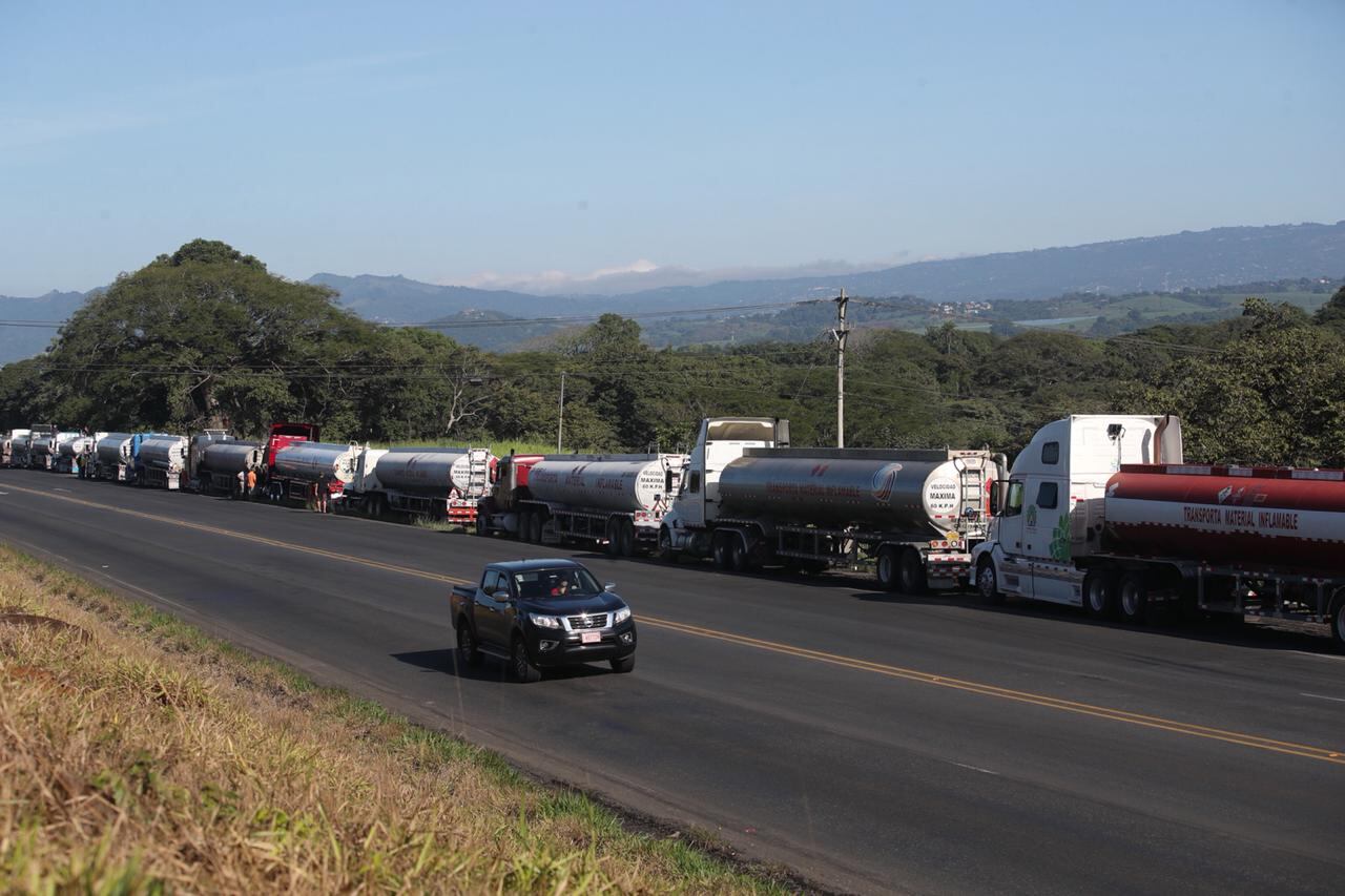 Estacionados a la orilla de la autopista hay cerca de 57 camiones esperando entrar al plantel de Recope, en La Garita.