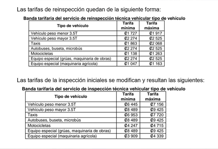 Esa modificación, realizada a dos días del reinicio de la revisión técnica vehicular a manos de la empresa alemana Dekra, se aparta de la tarifa de reinspección (¢1.917 para vehículos livianos) y obliga a los usuarios a pagar más. Por ejemplo, antes del decreto ejecutivo, el dueño de un automotor liviano que no aprobara la evaluación y tuviera que ir a reinspección, hubiera tenido que cancelar, en total, ¢10.003, pero con el cambio de reglas deberá pagar ¢16.172, lo que representa un aumento del 61%.