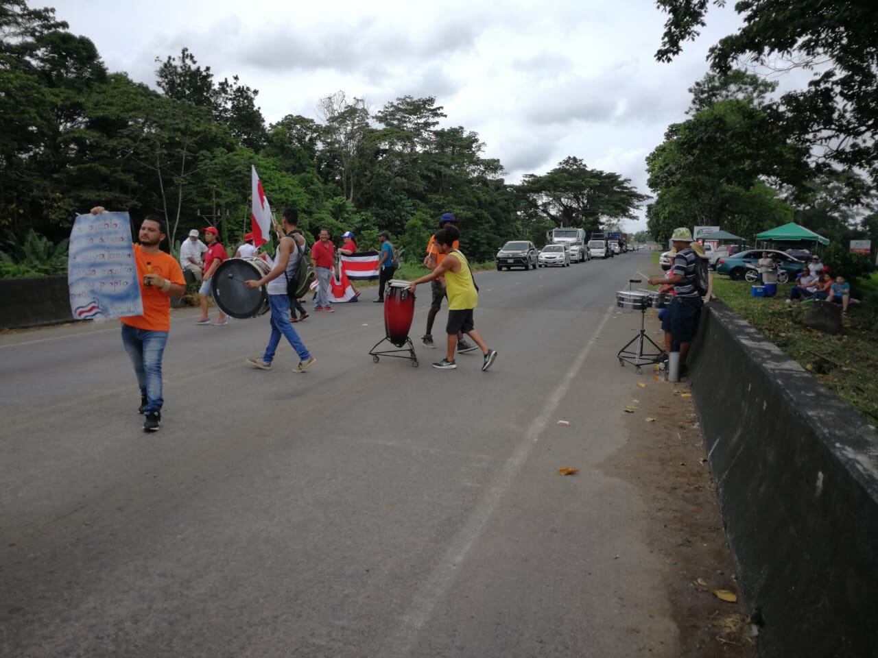 En el día décimo primer día de huelga, el grupo pequeño de manifestantes que impedían el paso en Guácimo llevaron música en vivo. Tenían protesta a ritmo de comparsa.