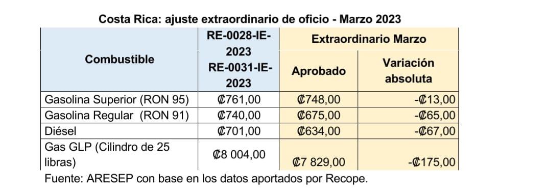 Con el cambio, el precio de la gasolina súper bajará de ¢761 a ¢748, el de la regular de ¢740 a ¢675 y el del diésel caerá de ¢701 a ¢634, una vez que el rebajo salga publicado en el diario oficial.