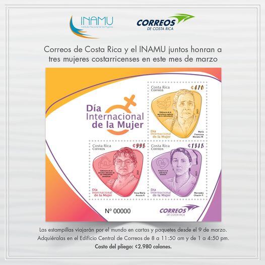 Los sellos se hicieron para rendir tributo a “tres ciudadanas destacadas en la defensa de los derechos de las trabajadoras, la salud pública, y la conservación ambiental: Rosita Acosta, Mercedes Chacón y Francisca Morales”, según comunicado del Instituto Nacional de las Mujeres (Inamu) del 9 de marzo.