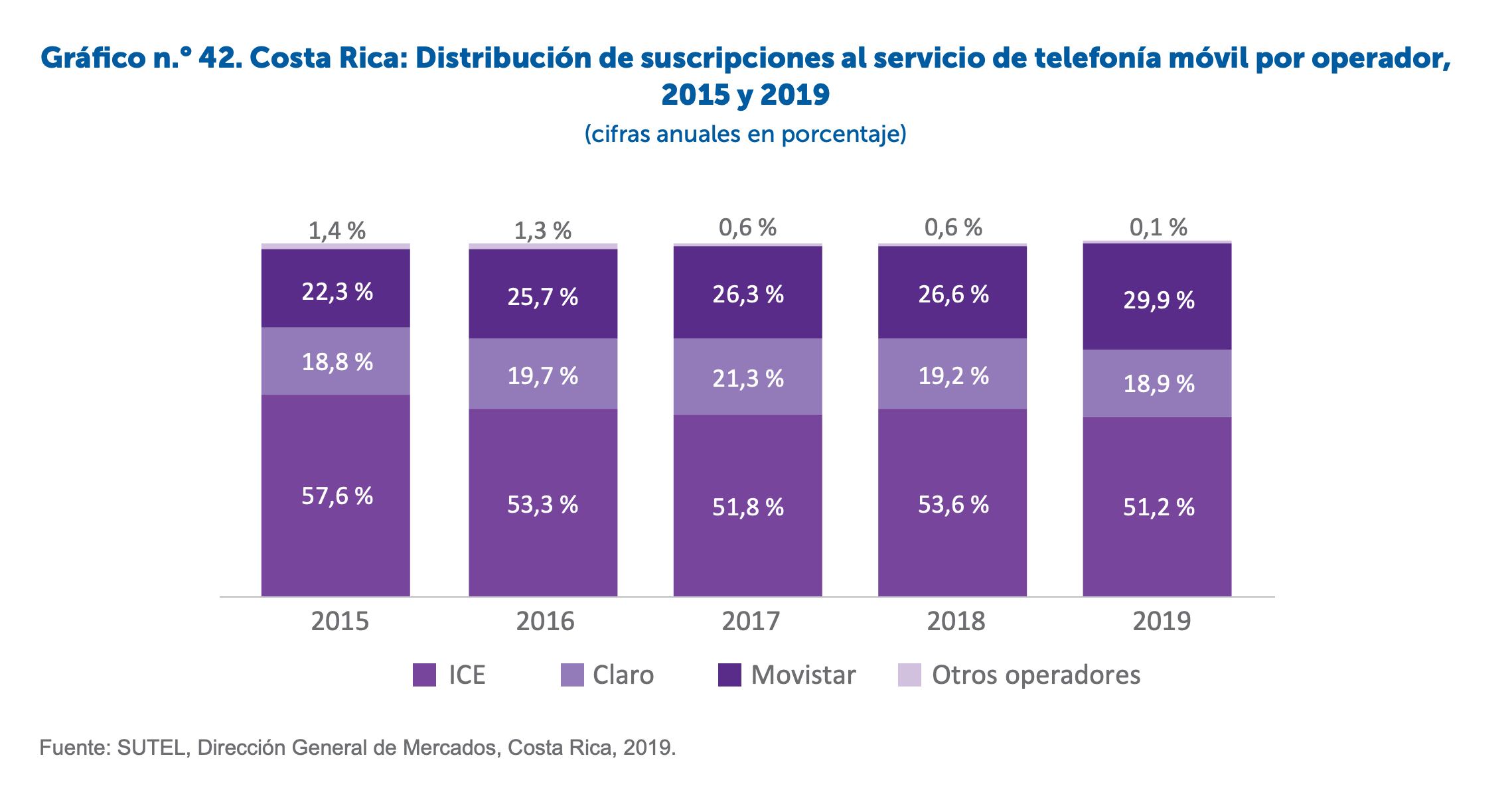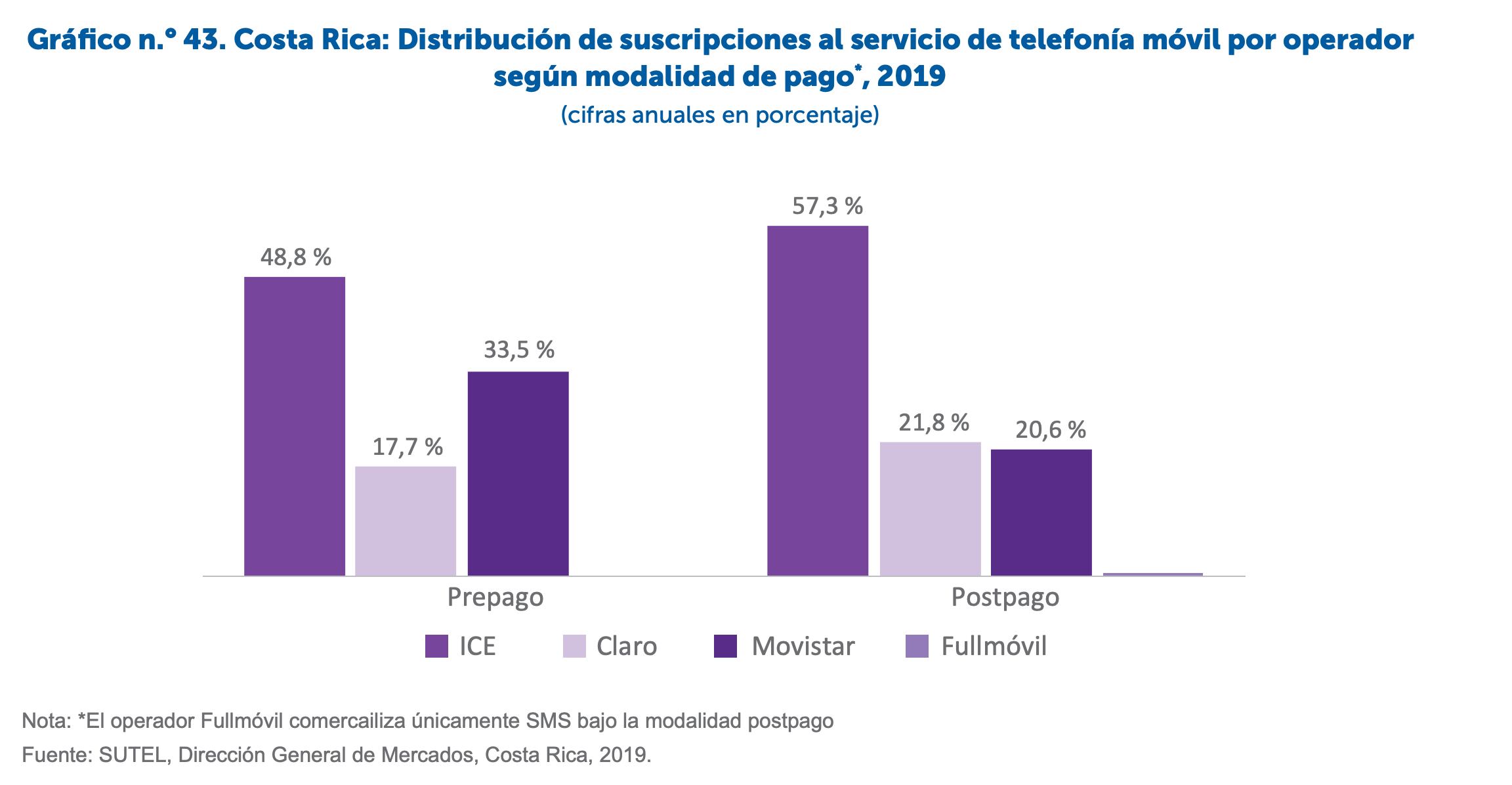 En el caso de prepago, el ICE posee la mayor participación con 48,8 % (2,5 puntos menos respecto al 2018), seguido de Telefónica con 33,5 % (4,2 puntos más) y Claro con 17,7 % (1 punto menos).