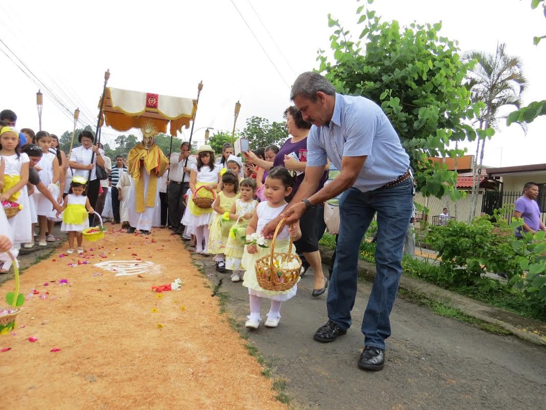 Por su parte, Melvin Fernández, cura párroco de Puriscal, encabezó la procesión por las principales calles de Santiago, donde los vecinos de diferentes comunidades alistaron el camino por donde pasó la procesión con el Santísimo Sacramento. Los niños le honraron tirando flores a su paso.