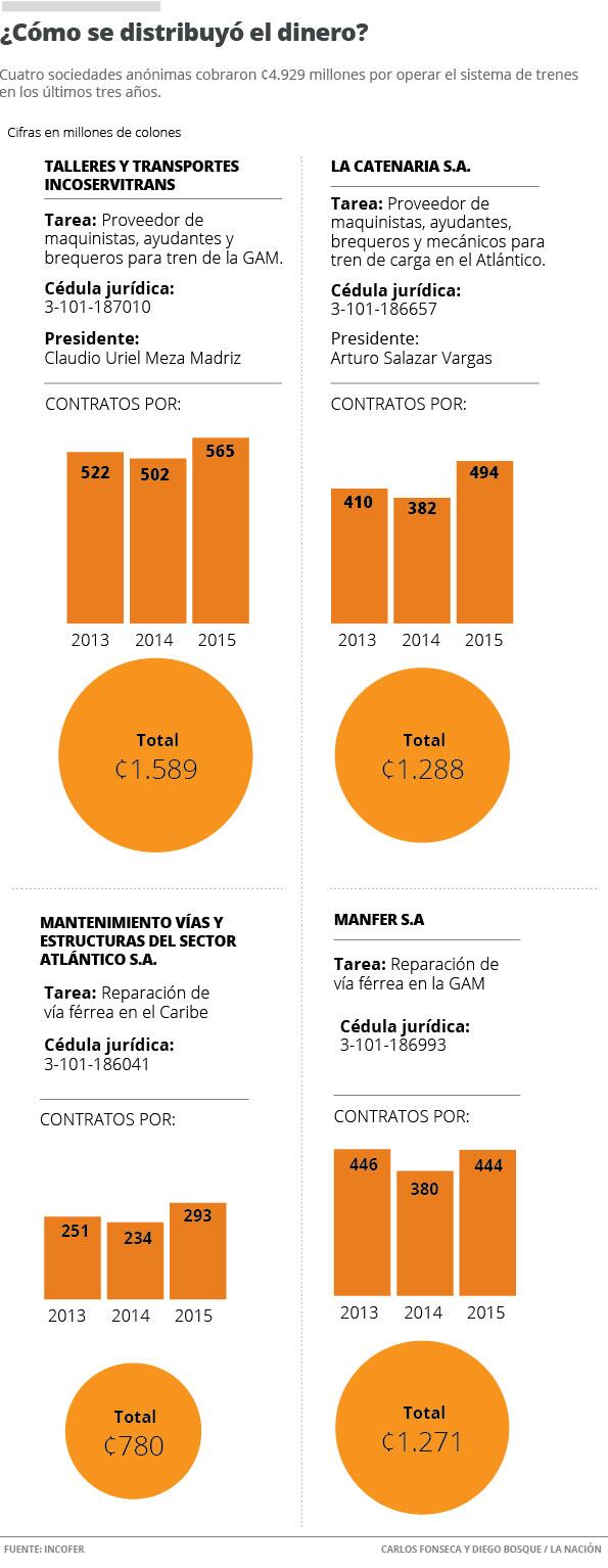 Según documentos en poder de La Nación, solo en los últimos tres años, estas firmas se adjudicaron contratos por ¢4.929 millones para dar servicios que incluyen mantenimiento de vías y equipo rodante, lo mismo que encargarse de la operación con maquinistas, ayudantes y brequeros.