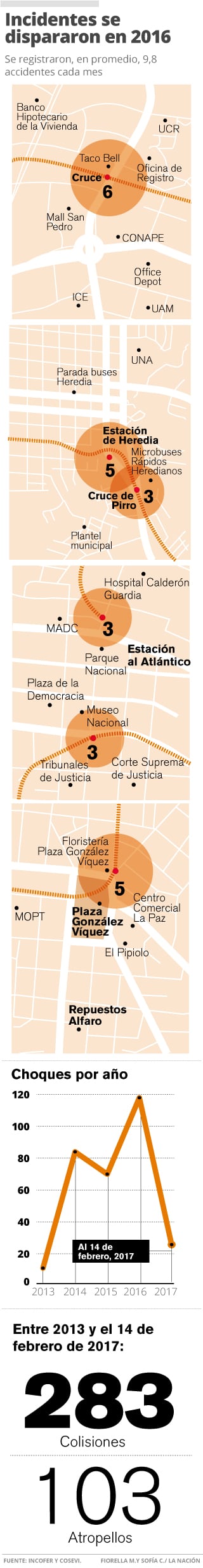 Esas actitudes son la causa de que, entre el 2013 y el pasado 14 de febrero, se hayan registrado 283 colisiones con el tren. El año más violento fue el 2016, durante el cual hubo 118 choques: 42 en la ruta San José-Cartago, 41 en la ruta San José-Heredia-Alajuela, 28 en la vía a Belén y siete en otros servicios especiales de Incofer.
