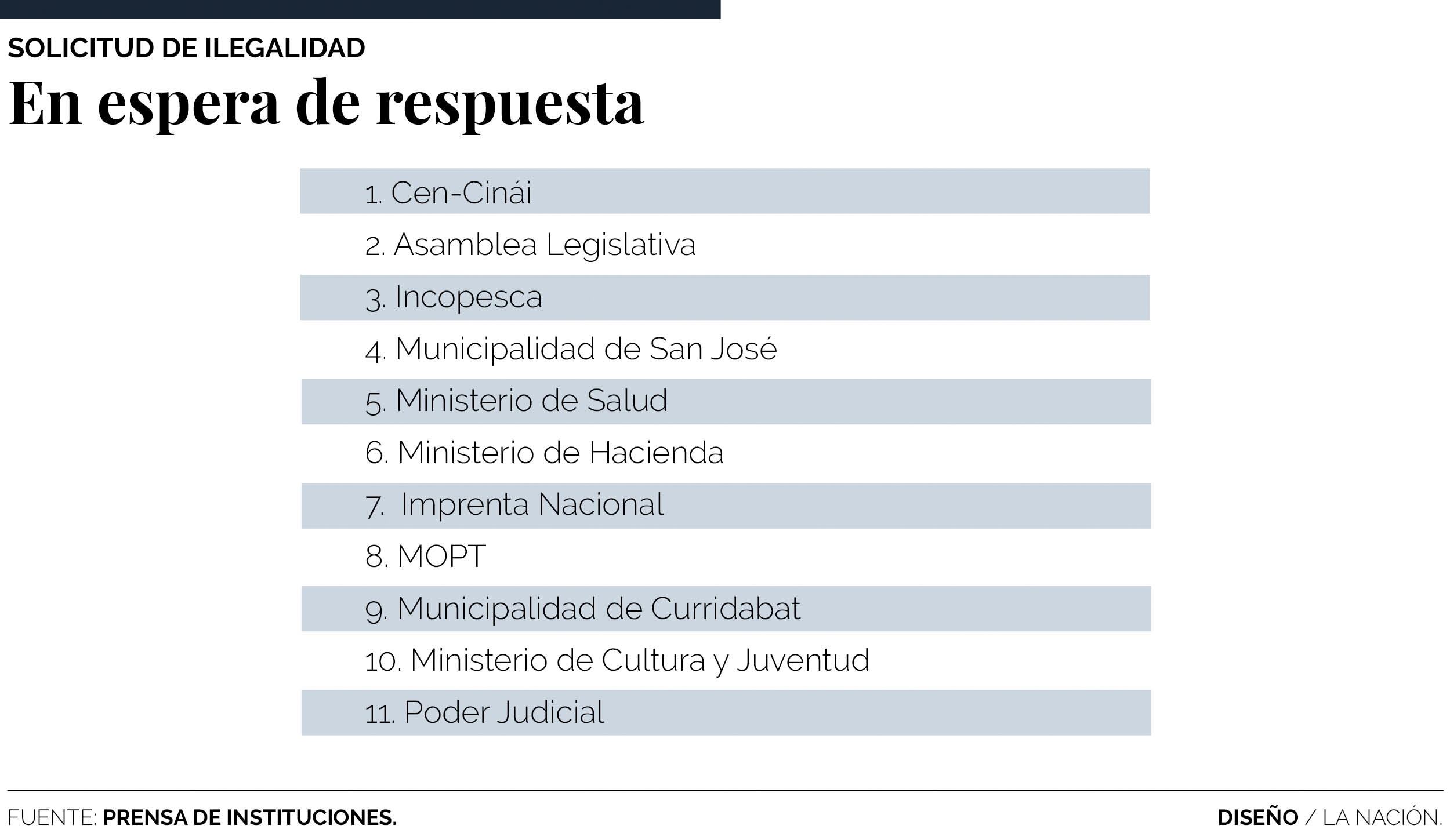 De esos, no se conoce sentencia de primera instancia (juzgado) para el cese de labores de los trabajadores de Cen-Cinái, Asamblea Legislativa, el Instituto Costarricense de Pesca y Acuicultura (Incopesca), la Municipalidad de San José, Municipalidad de Curridabat, el Ministerio de Salud, Ministerio de Hacienda, Ministerio de Cultura y Juventud, Ministerio de Obras Públicas y Transportes (MOPT), la Imprenta Nacional y el Poder Judicial.