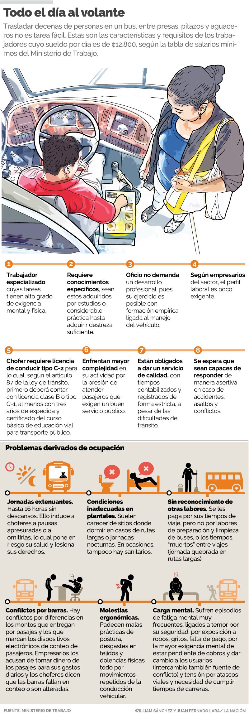 Cindy Coto, directora del Consejo de Seguridad Vial (Cosevi), y citada en la investigación, describe así el trabajo de estos choferes: "deben de manejar el bus, a la gente, cumplir con el tiempo, estar alertas, ser amables y limpiar el autobús. Todo en una posición incómoda, con gente molesta que muchas veces grita y es malcriada, en un ambiente encerrado y expuesto a ruidos fuertes hasta por 16 horas diarias".