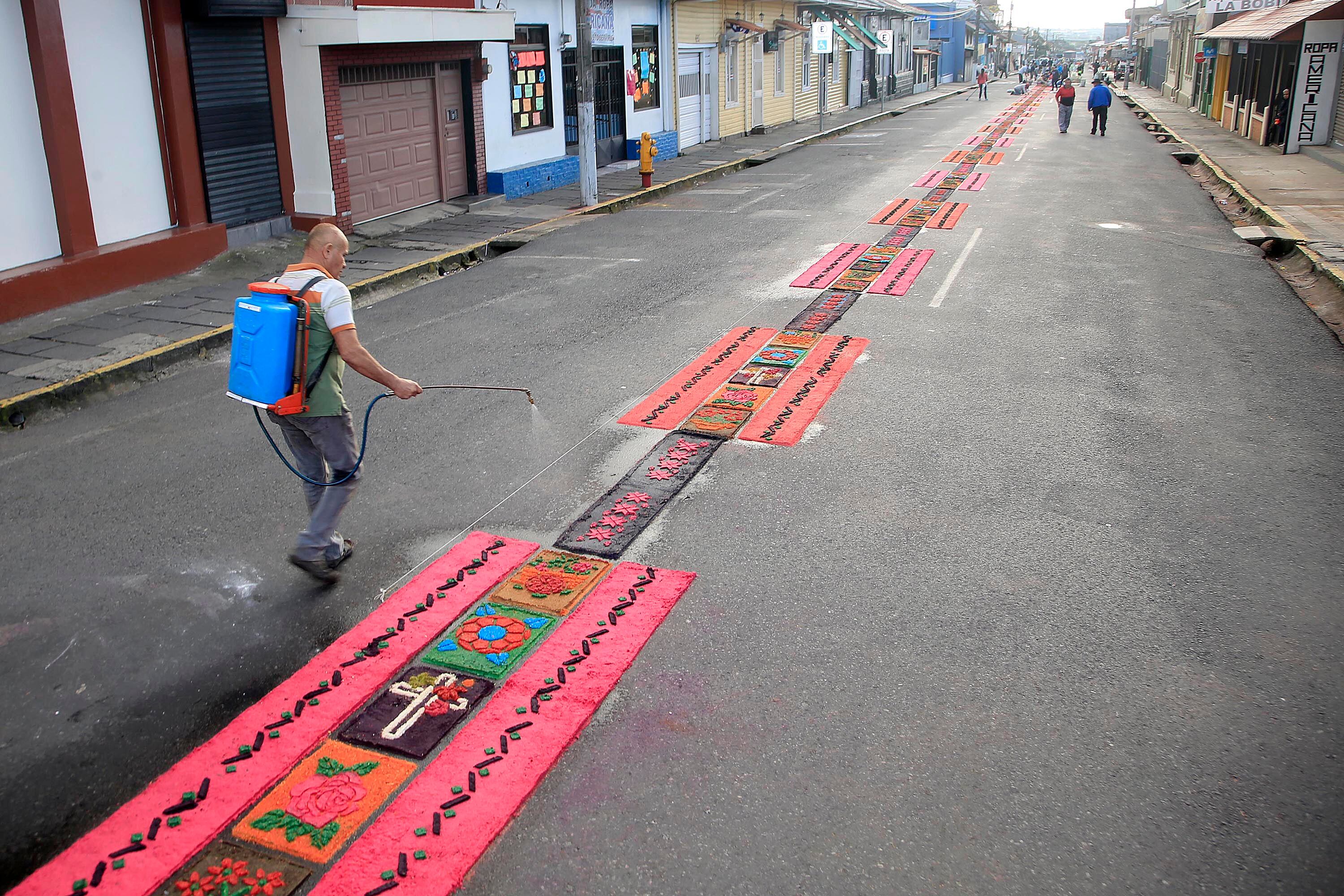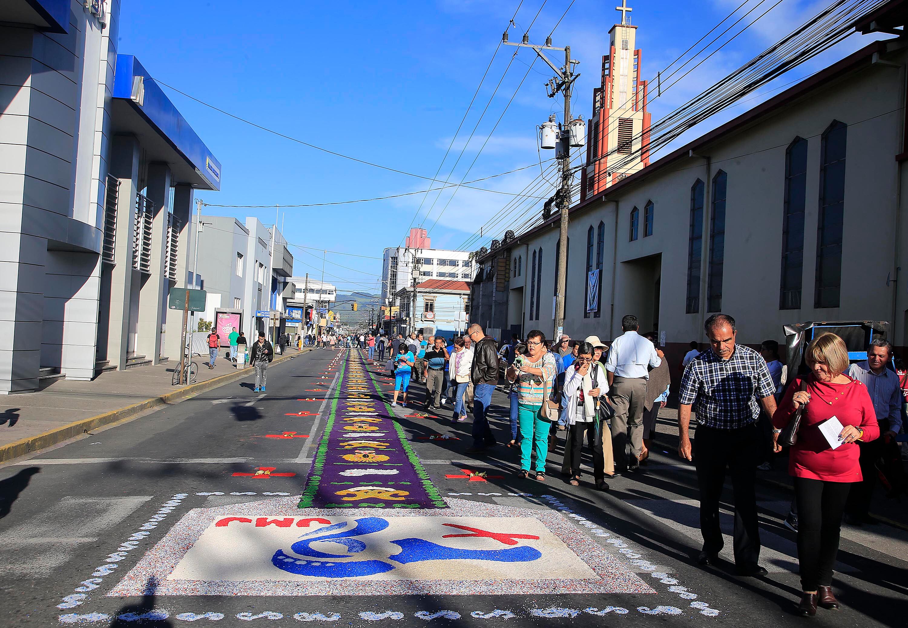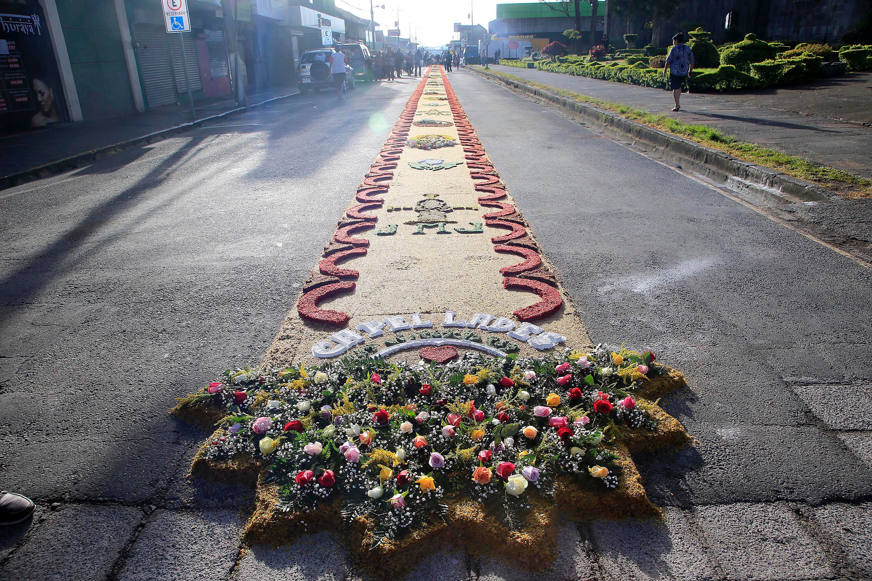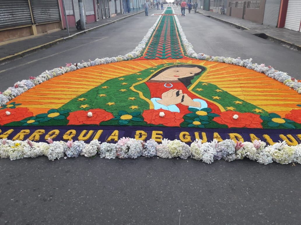 Diecinueve parroquias de la provincia participan en la confección de este arte efímero que se extiende a lo largo de casi dos kilómetros entre la catedral de Santiago Apóstol (conocida como la iglesia de El Carmen) y la casa de La Negrita, patrona de Costa Rica.