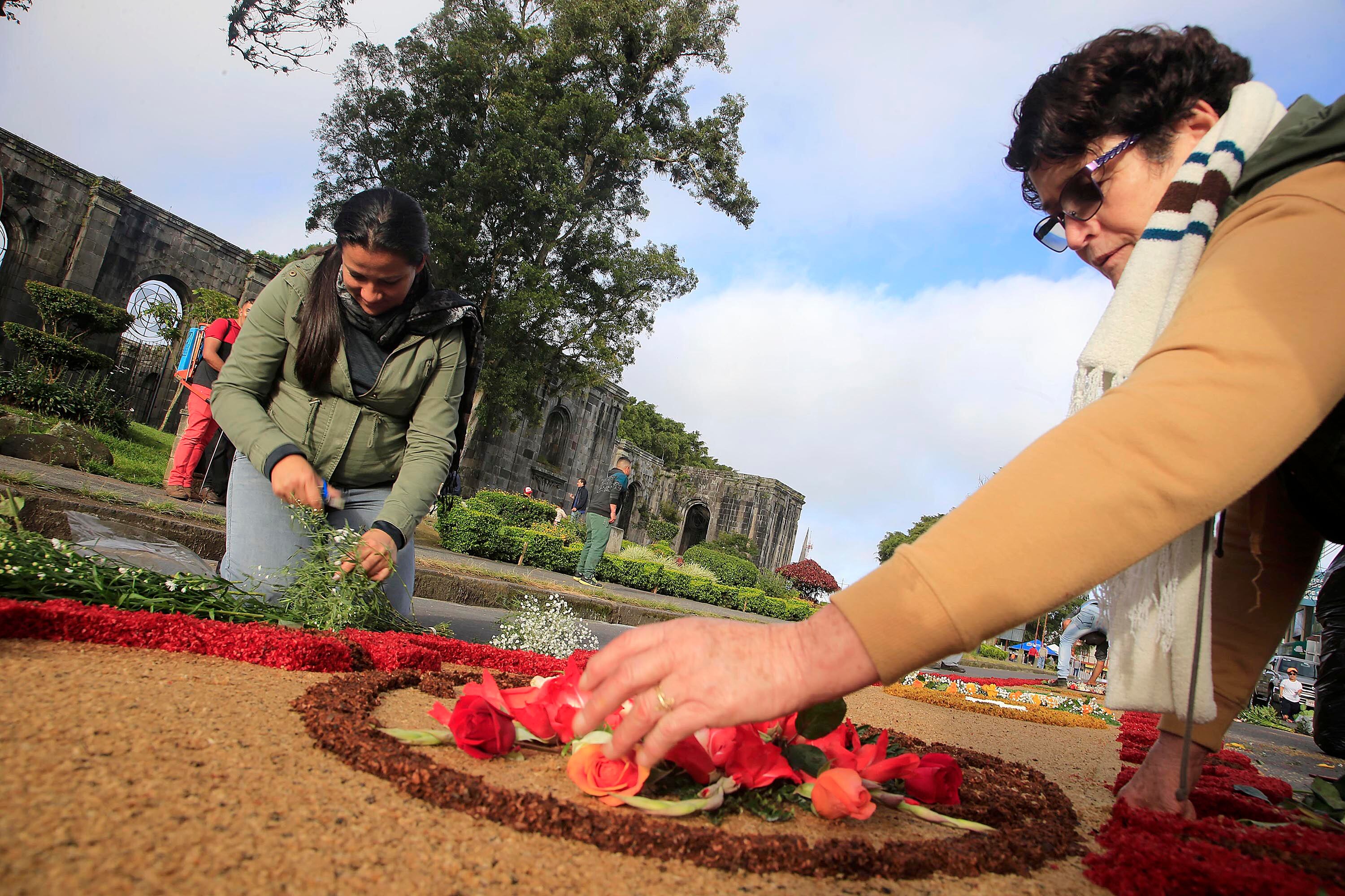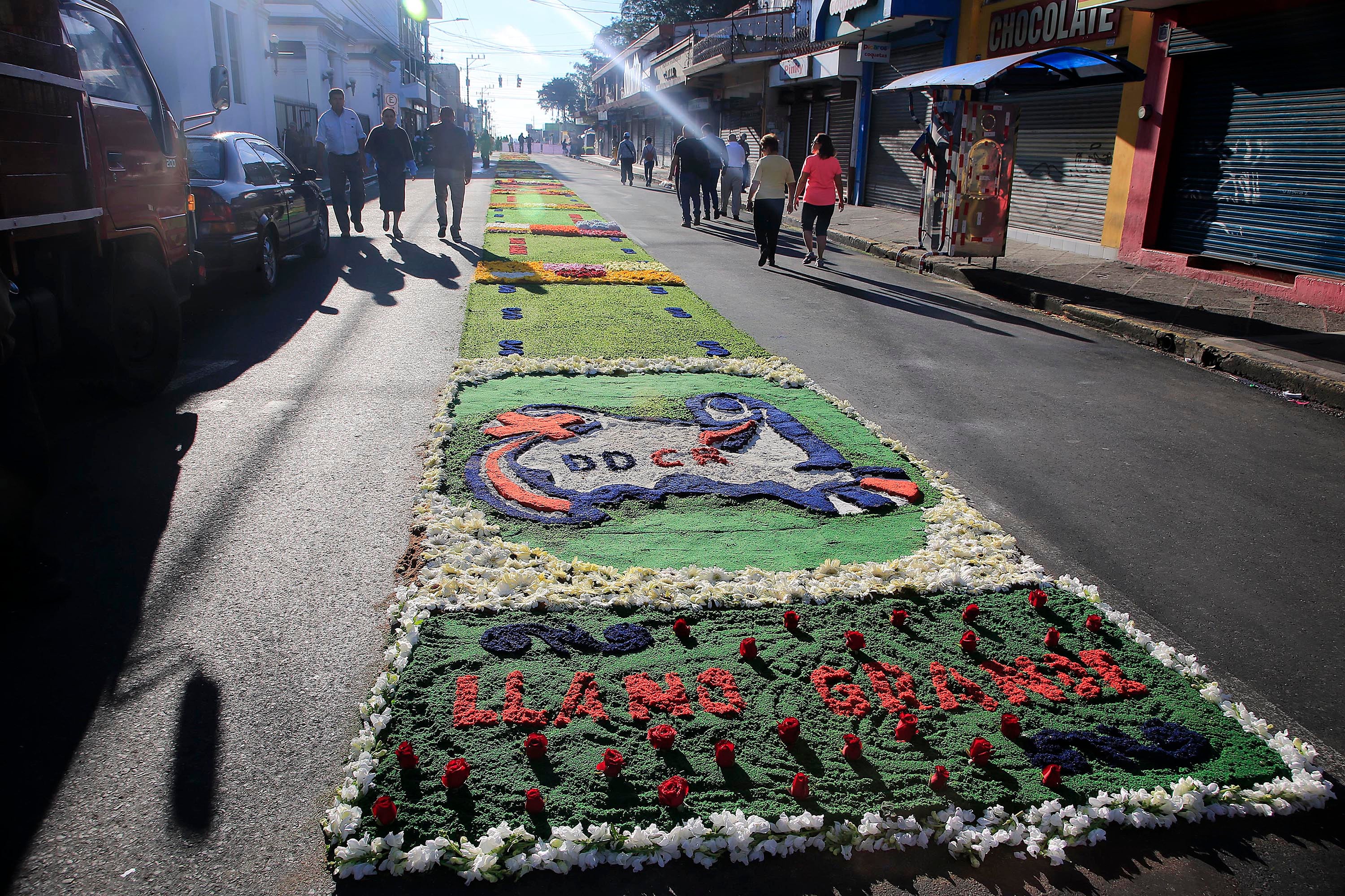 “A las 10 de la noche ya estábamos trabajando 30 personas y los materiales fueron donados por las diferentes personas de sectores como Llano Grande, Tejar y floristerías del centro de Cartago. Tenemos cuerina, aserrín, cascarilla, rosas, hortensias y otra variedad de flores, no invertimos nada económicamente, si no el tiempo de todos los compañeros y algunos de ellos debieron teñir el aserrín y realizar los diseños”, explicó René Araya de la Comisión de Bomberos Voluntarios de Cartago.