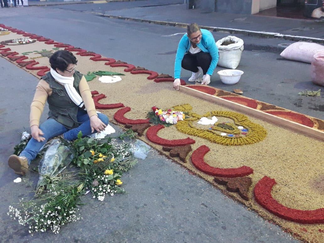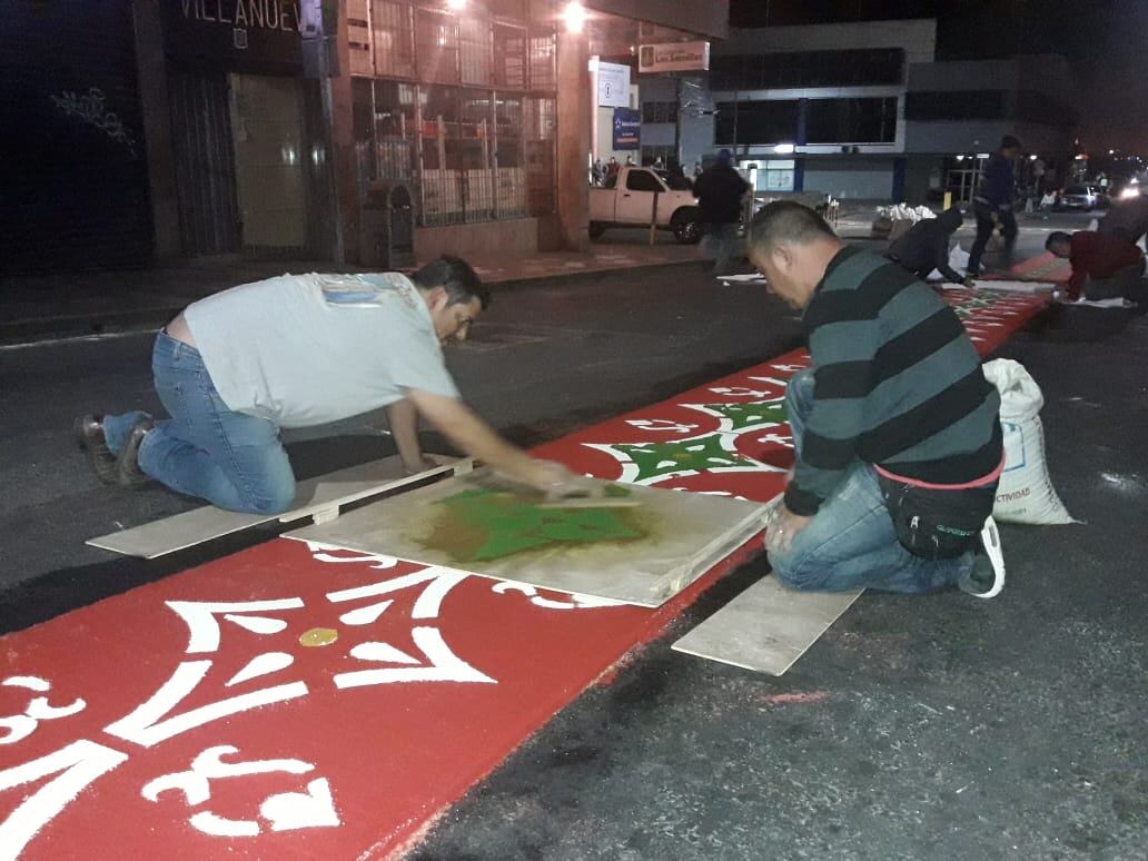 William Rivera Mendoza, cura párroco de la parroquia Nuestra Señora de Guadalupe, llegó con un grupo de vecinas de la comunidad a las 4:30 a. m. a dejarles gallo pinto con café y agua dulce a los encargados de las alfombras de esta comunidad.