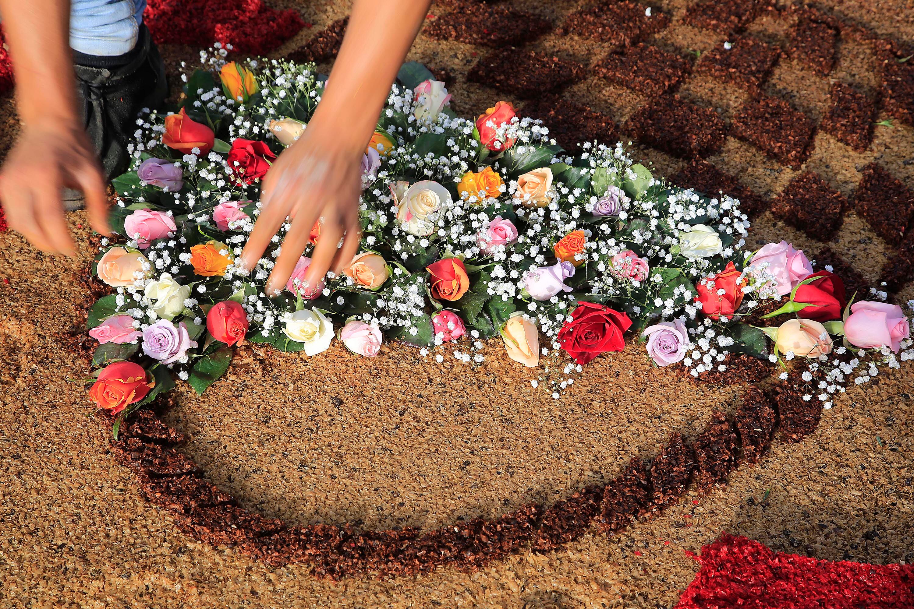 Los curiosos vieron en las alfombras imagénes de la Virgen, del Corazón de Jesús y diferentes figuras geométricas hechas con rosas, pomas, yerberas, claveles, aserrín, cal, broza de café teñida, helechos y hasta plástico reciclado.