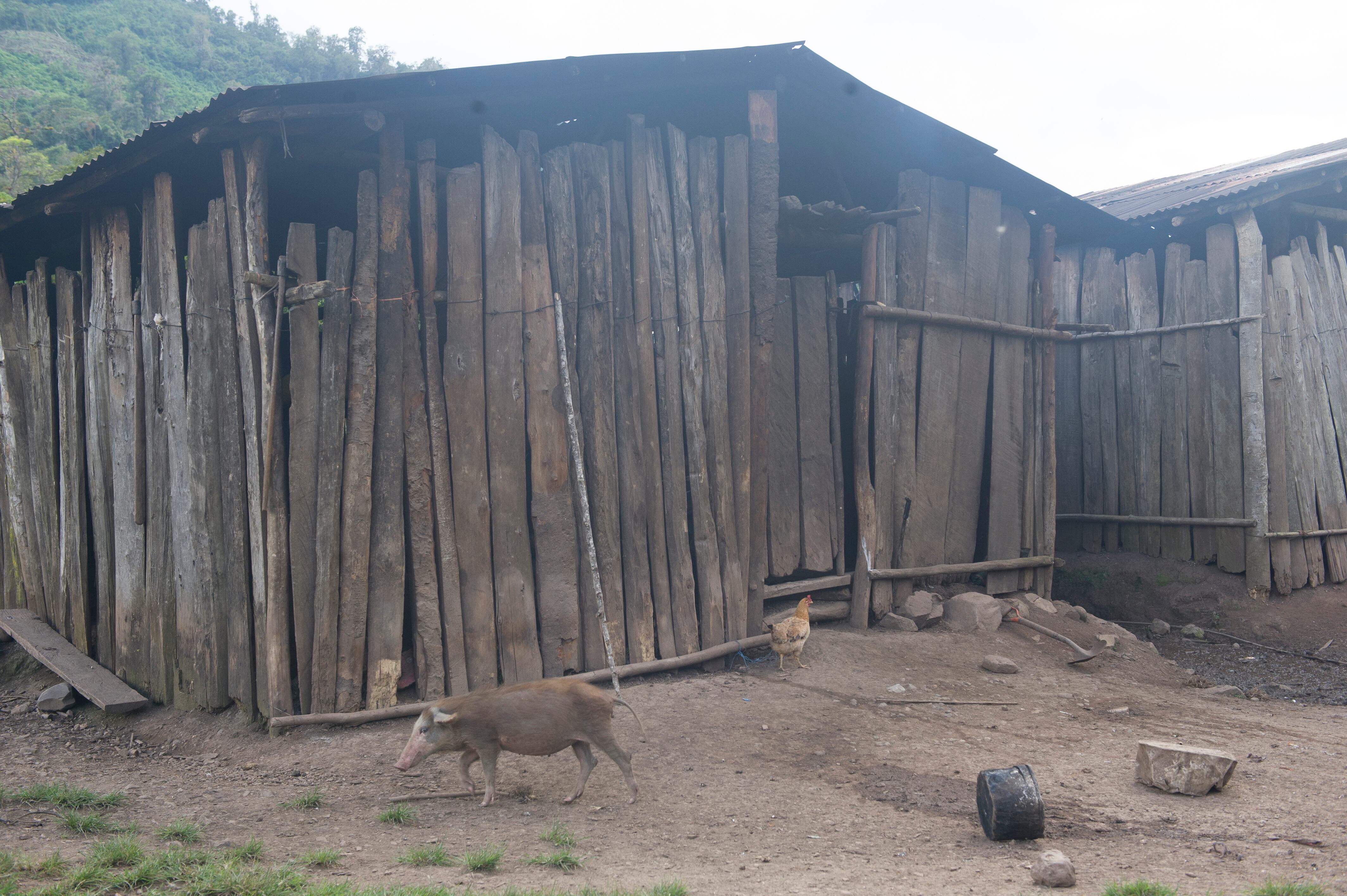 Su casa, de piso de tierra, está construida con tablones mal cortados de madera de balsa, por lo que entre las grandes rendijas pueden ver, a las personas que se acercan. En la noche se meten los perros y hasta los chanchitos pequeños que deambulan a su antojo.