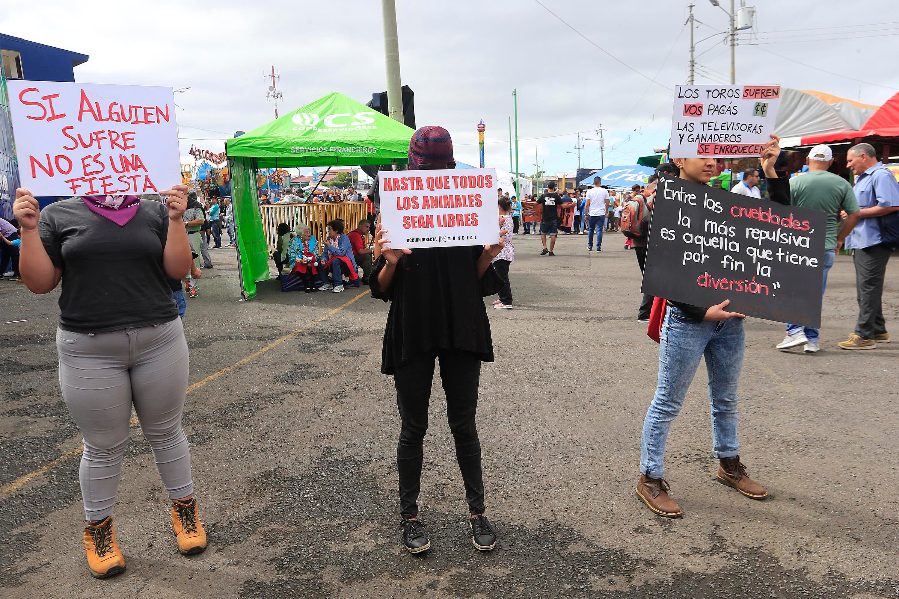Una veintena de personas se reunió la tarde de este miércoles previo al arranque de las corridas de toros en Zapote, para manifestarse en contra de esa actividad, por considerar que expone a los animales a sufrimiento y maltrato.