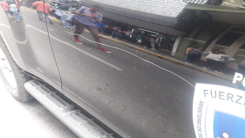 Los huelguistas además insultaban al mandatario mientras avanzaba hacia el vehículo.