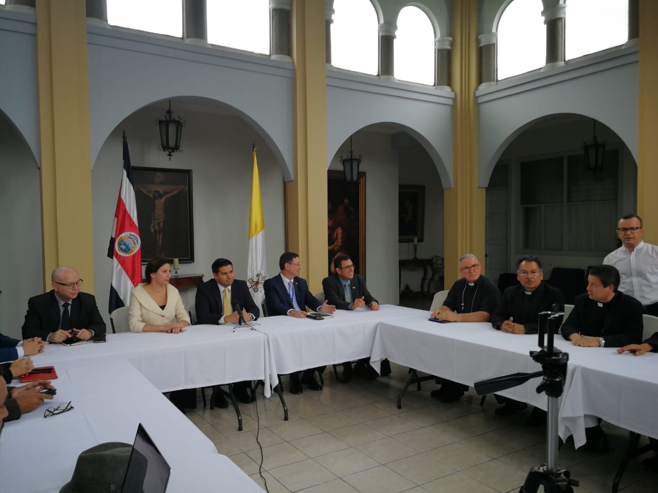 “Ese primer acercamiento se daría cuando la Iglesia convoque a las partes. De ahí surgiría una eventual mesa de diálogo, desde donde se realizaría un eventual proceso de negociación. Estamos muy optimistas como Gobierno de la República porque vemos posibilidades de que se genera un espacio de acercamiento para que esto derive en un eventual proceso de diálogo”, mencionó Steven Núñez, ministro de Trabajo, al término de la reunión con los representantes de la Conferencia Episcopal.