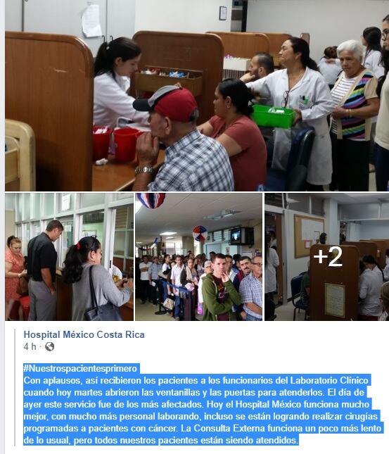 El Hospital México compartió en su página de Facebook como los pacientes celebraron que este martes los empleados del servicio de Laboratorio sí acuderon a trabajar, pues el lunes unos 400 asegurados se quedaron sin exámenes.