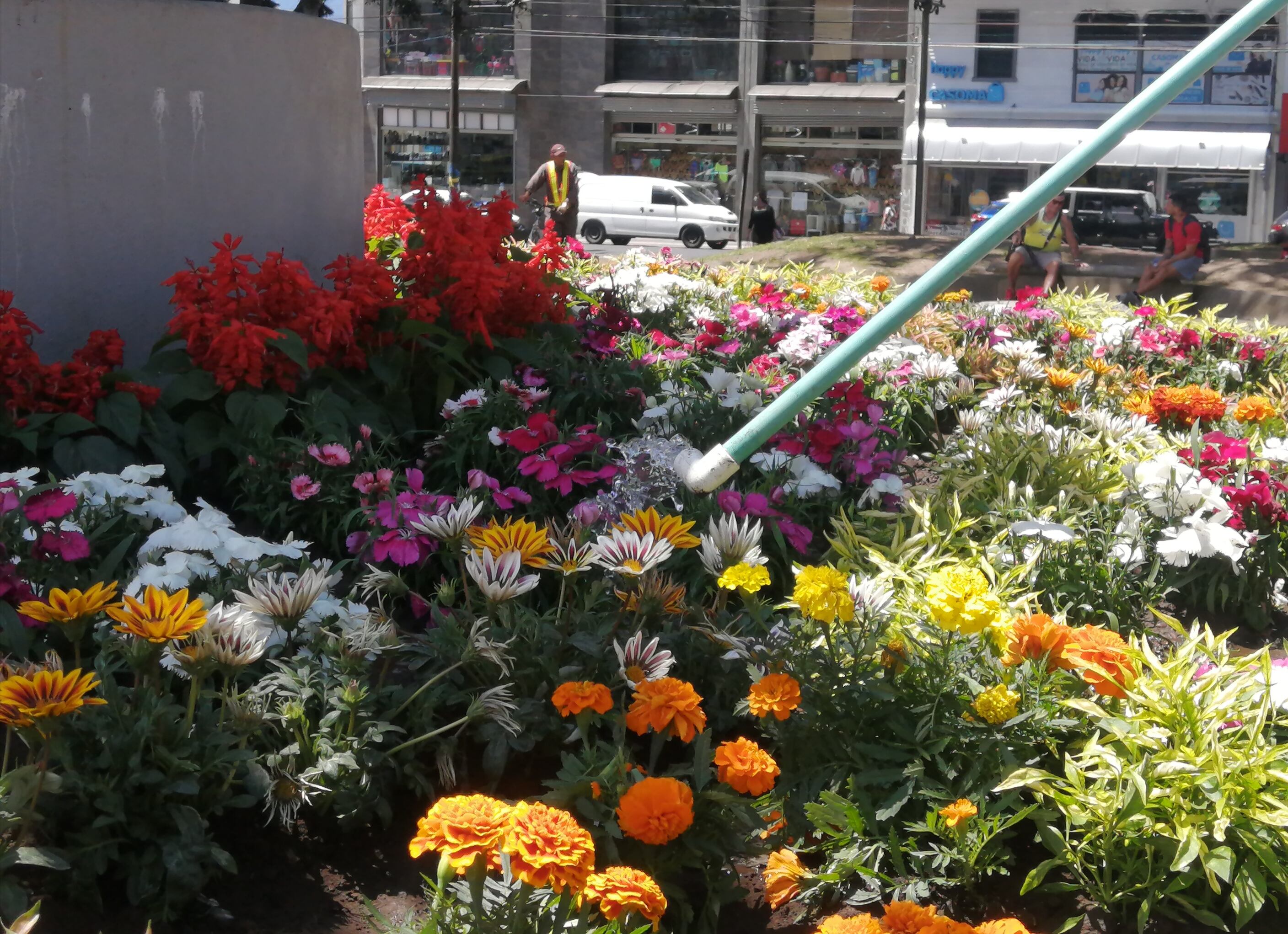 Entretanto, los jardines comenzaron a mostrar su colores desde el miércoles, cuando los trabajadores del Departamento de Parques y Ornamento de la Municipalidad trabajaron durante casi cinco horas en el relleno de la pileta que rodea la escultura y se encargaron de sembrar diversas especies de flores, traídas de la zona norte de Cartago.