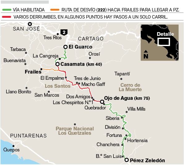 Actualmente, el paso está abierto desde El Guarco hasta Casa Mata (a la altura del kilómetro 40), donde aún se trabaja en un derrumbe de grandes dimensiones. En ese punto los vehículos se pueden desviar por la ruta 222 hasta salir a Frailes de Desamparados para dirigirse a la zona de Los Santos y acceder nuevamente a la Interamericana.