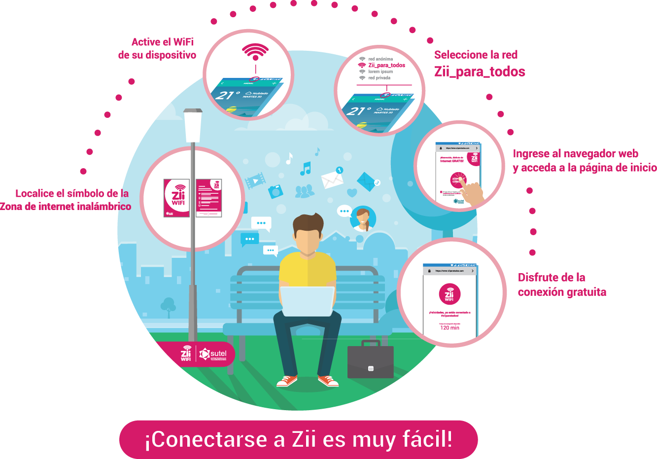 El usuario debe localizar en el lugar (parque, plaza, salón comunal o biblioteca) el símbolo de Internet Inalámbrico (ZII wifi).