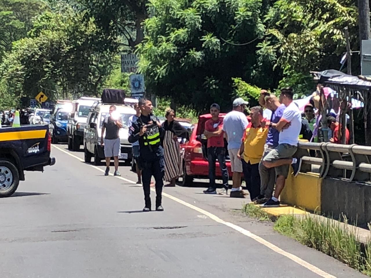 “Estoy aquí desde las 9:30 a. m. voy con mercadería desde Panamá para Guatemala, estoy un poco desesperado porque tengo que llegar hoy a la frontera de Peñas Blancas”, decía el transportista panameño Yader Almircar, a la 1:20 p. m. de este jueves en el puente sobre el Grande de Térraba en Palmar Norte.