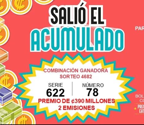 En el sorteo de la Lotería Nacional realizado este domingo 30 de enero por la Junta de Protección Social (JPS) salió el Acumulado, cuya bolsa tenía ya ¢390 millones; el número 78, con la serie 622, fue el favorecido.