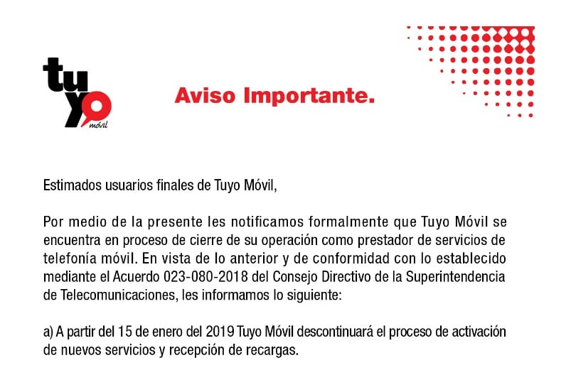 La página en línea de Tuyo Móvil comunica que esta compañía “se encuentra en proceso de cierre de su operación como prestador de telefonía móvil” y hace referencia a la decisión conforme un acuerdo del Consejo Directivo de la Superintendencia de Telecomunicaciones (Acuerdo 023-080-2018).