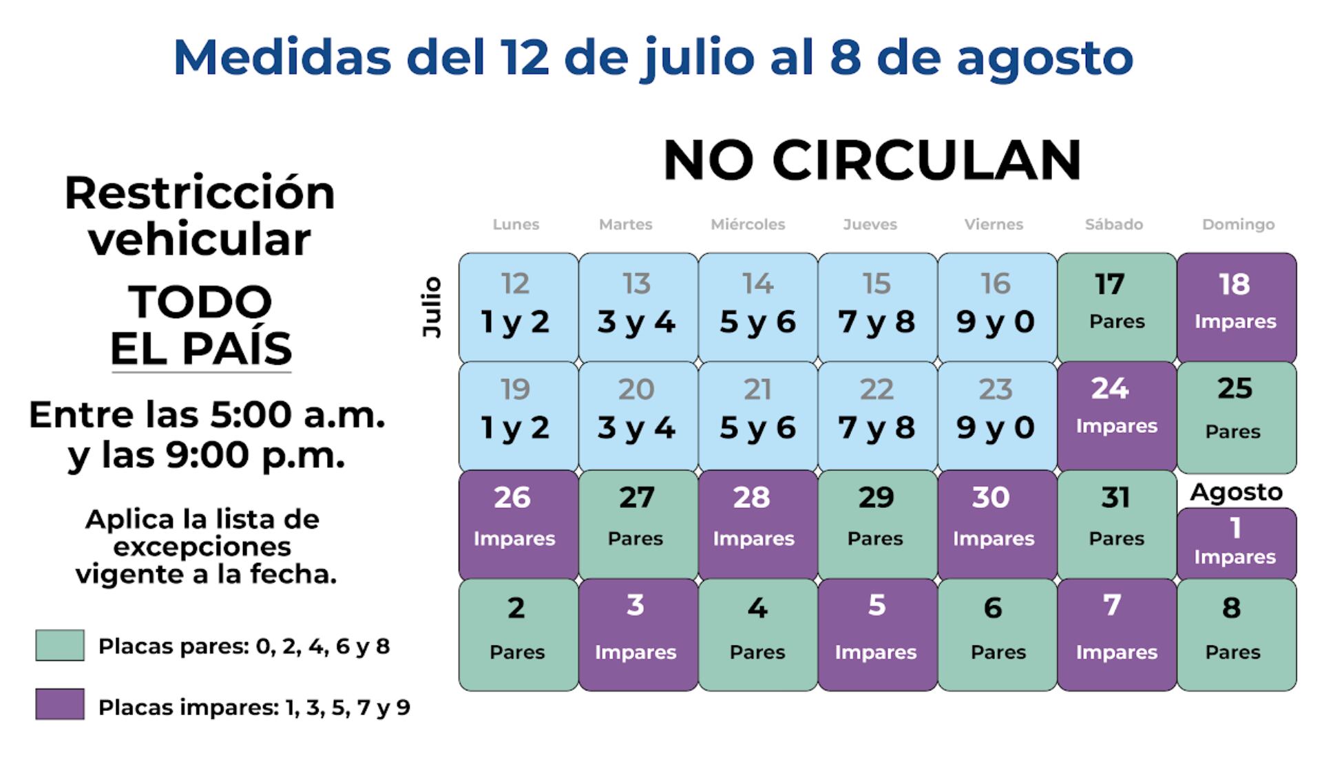 Mientras que para las semanas entre el 26 de julio y el domingo 8 de agosto, el país volverá, todos los días, a una restricción más estricta con el sistema de alternancia de placas por placa par o impar.