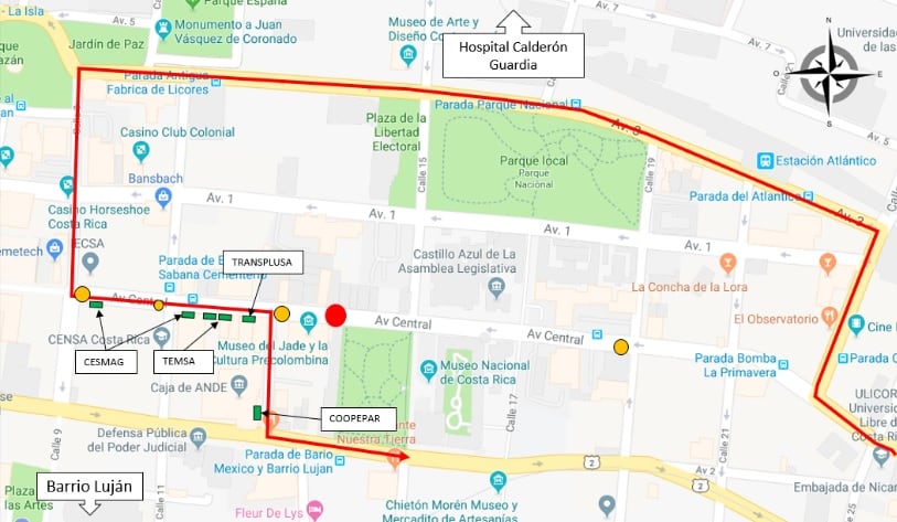 La modificación obedece al cierre de vías sobre la avenida central, entre las calles 13 y 19 por trabajos de sustitución de tubería potable, cerca de donde se construye el nuevo edificio de la Asamblea Legislativa.